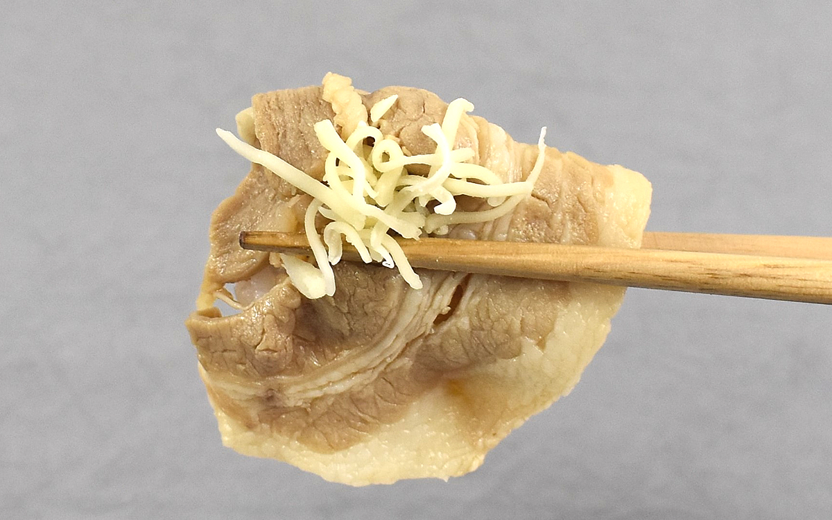まずはメインの豚肉をチェック。濃いめに味つけされている豚肉は、ジューシーで噛みごたえバツグンです。じつは豚肉の厚さが従来の1.3mmから1.5mmへと変更されており、豚肉本来の旨味をより感じられる仕上がりに。分厚い豚肉はたれが絡みやすく、コクのある贅沢な味を堪能できました。