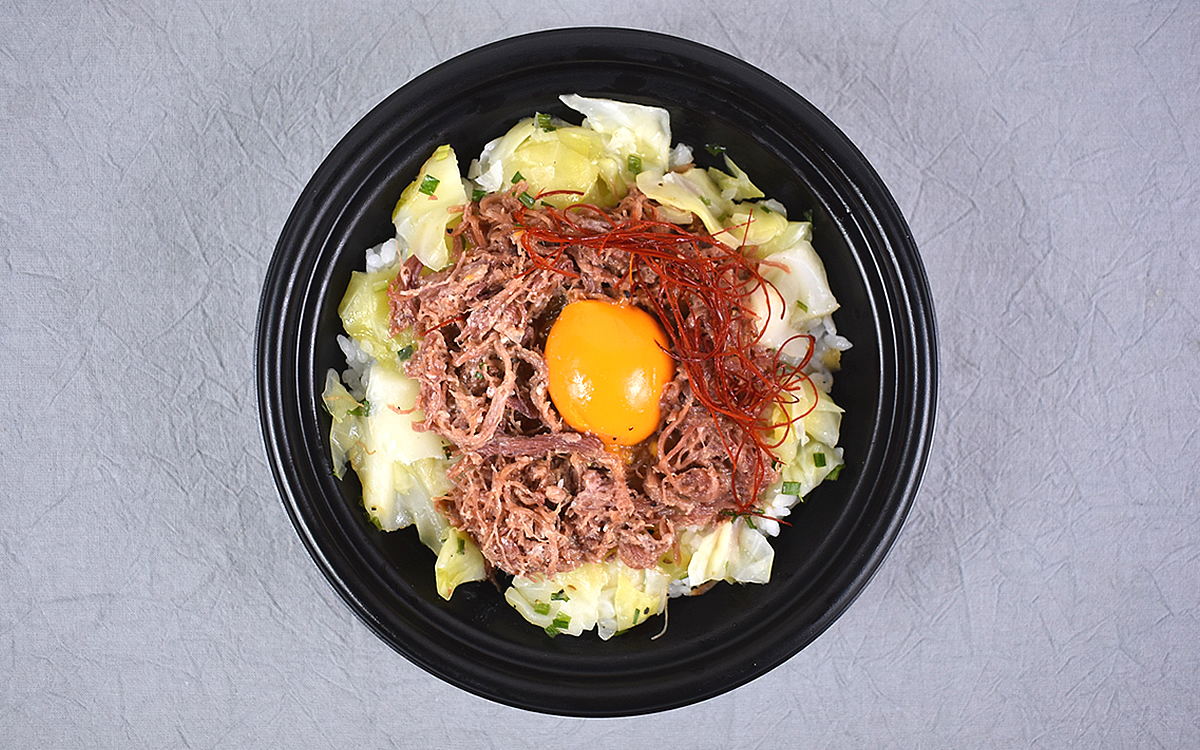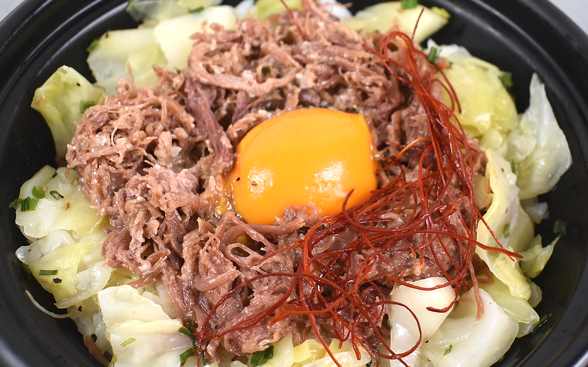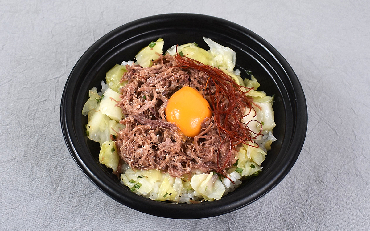 どんぶりとなって登場した「ごま油香る! ねぎ塩コンビーフ丼」は、黄身とともに濃厚な塩ダレを絡めたキャベツもたっぷりトッピング。塩ダレにはごま油の風味も効いていて、フタを開けた瞬間に芳醇な香りがふわりと舞い上がりました。