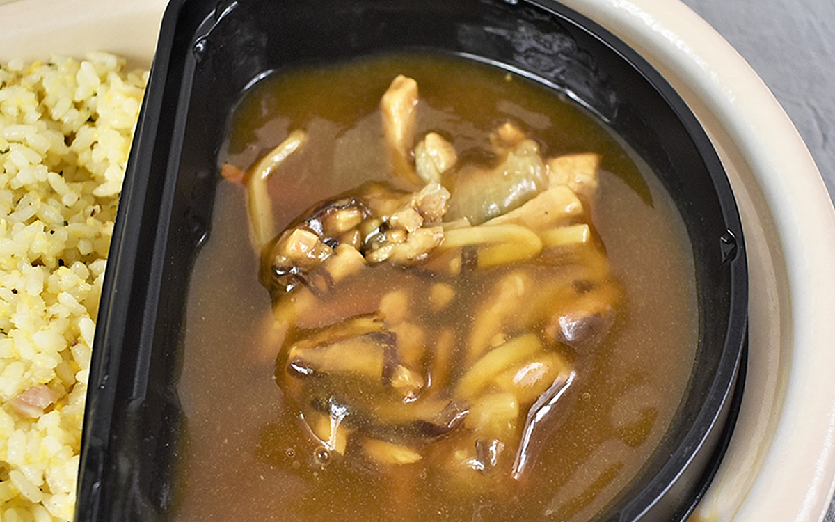 フォンドヴォー×スパイス=優しい味!? ローソンの「黒いカレーと彩り野菜のおうどん フォンドボー仕立て」の見た目と味のギャップが楽しい