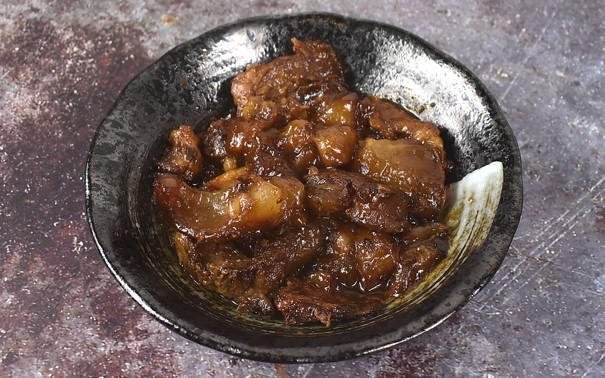 レトルトパウチから皿に移し替えると、芳醇な香りとともに味噌の染みこんだ牛すじ肉がごろごろ。ほどよく柔らかい状態に煮こまれていて、口の中でほぐれていくような食感が広がっていきました。またコラーゲンもたっぷりながらクセがないため、肉の脂身が苦手という方でも安心して口にできるのではないでしょうか。