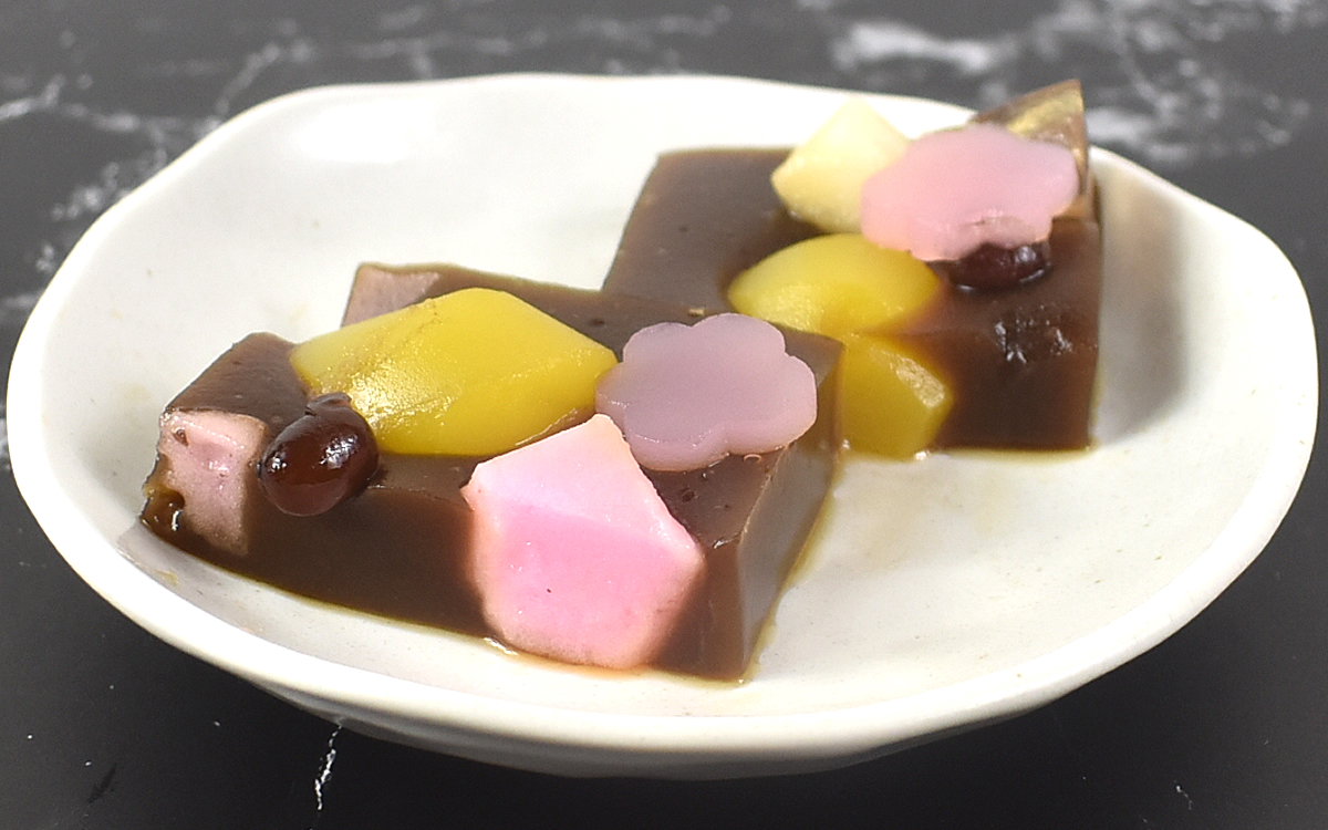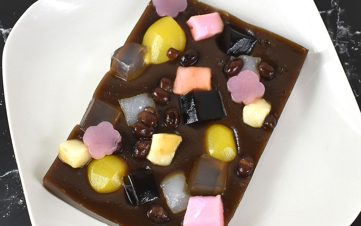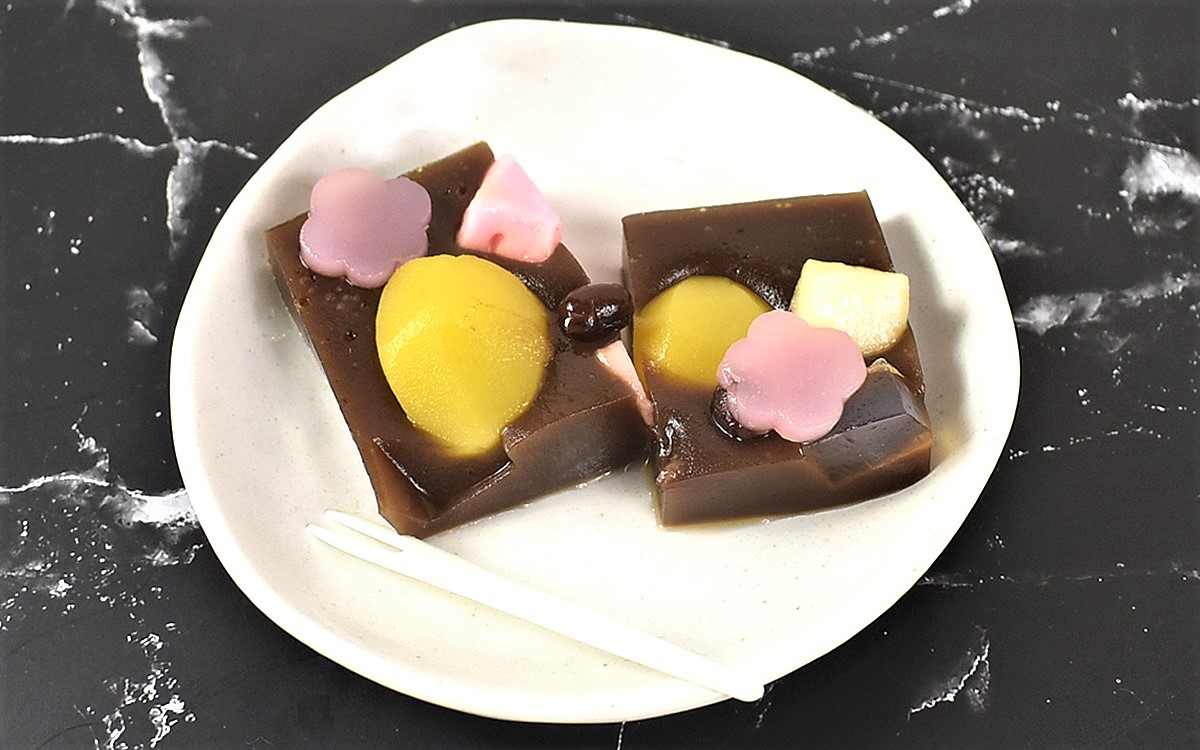 存在感のある色とりどりの装飾が目を引く「一枚流し あんみつ水羊羹」。羊羹の上には寒天や栗、葛もち、紅白の羽二重餅、お花の羊羹、大納言あずきなどが飾られています。菓子創作歴50年以上のキャリアを持つ職人によって1つずつ丁寧に作られているそうで、キラキラ輝く羊羹に思わずうっとり……。見る人の心も癒してくれる贅沢な一枚流しの羊羹です。