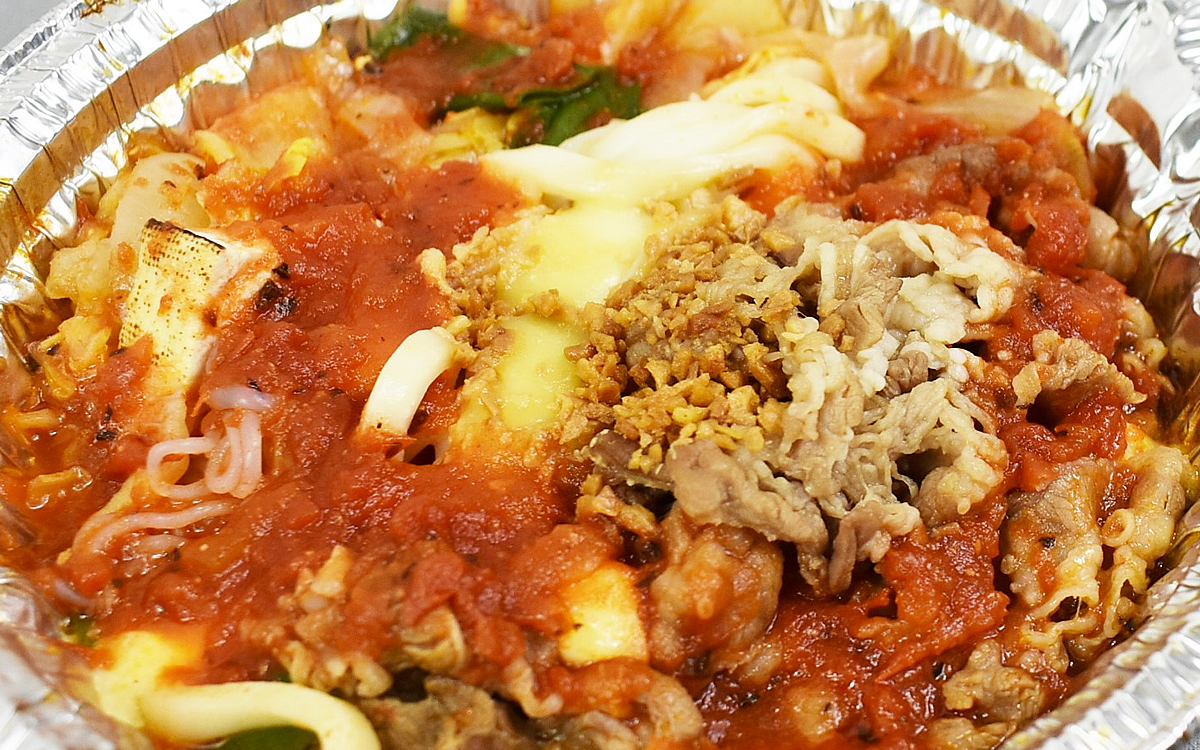その真っ赤な見た目からいかにも辛そうにですが、同商品の味つけは甘みのあるトマトスープベースなのでご心配なく。鍋の容器はアルミで作られており、ガスコンロとIH両方に対応しています。中火で約2分加熱し、チーズが溶け出してきた時が食べごろ。まずは白菜やにんじん、玉ねぎといった野菜から食べていきましょう。
