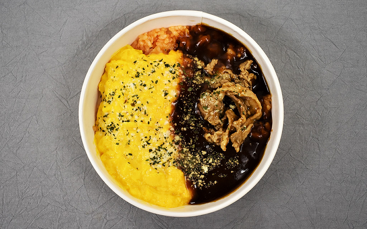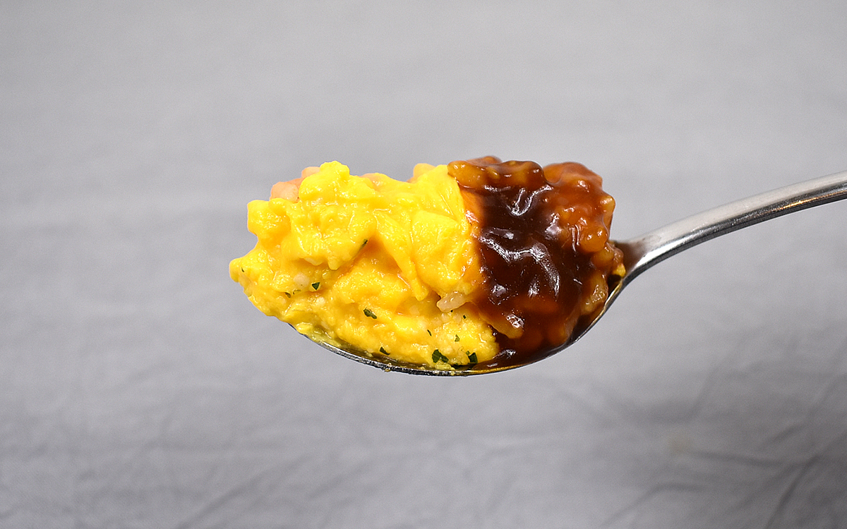 まずは“とろとろ卵”と謳うオムライスから試食。一般的なスクランブルエッグのような卵を想定していたのですが、予想以上にふわふわとした食感が口いっぱいに広がりました。まろやかな卵と香り高いデミグラスソースを一緒に食べれば、洋食店にも引けを取らない旨味溢れる味わいに。しかも、ふんだんに入った牛肉には、お肉を柔らかくする“塩こうじ”を使用。牛肉の柔らかい口当たりを楽しめるほか、肉汁溢れるジューシーさも堪能できます。
