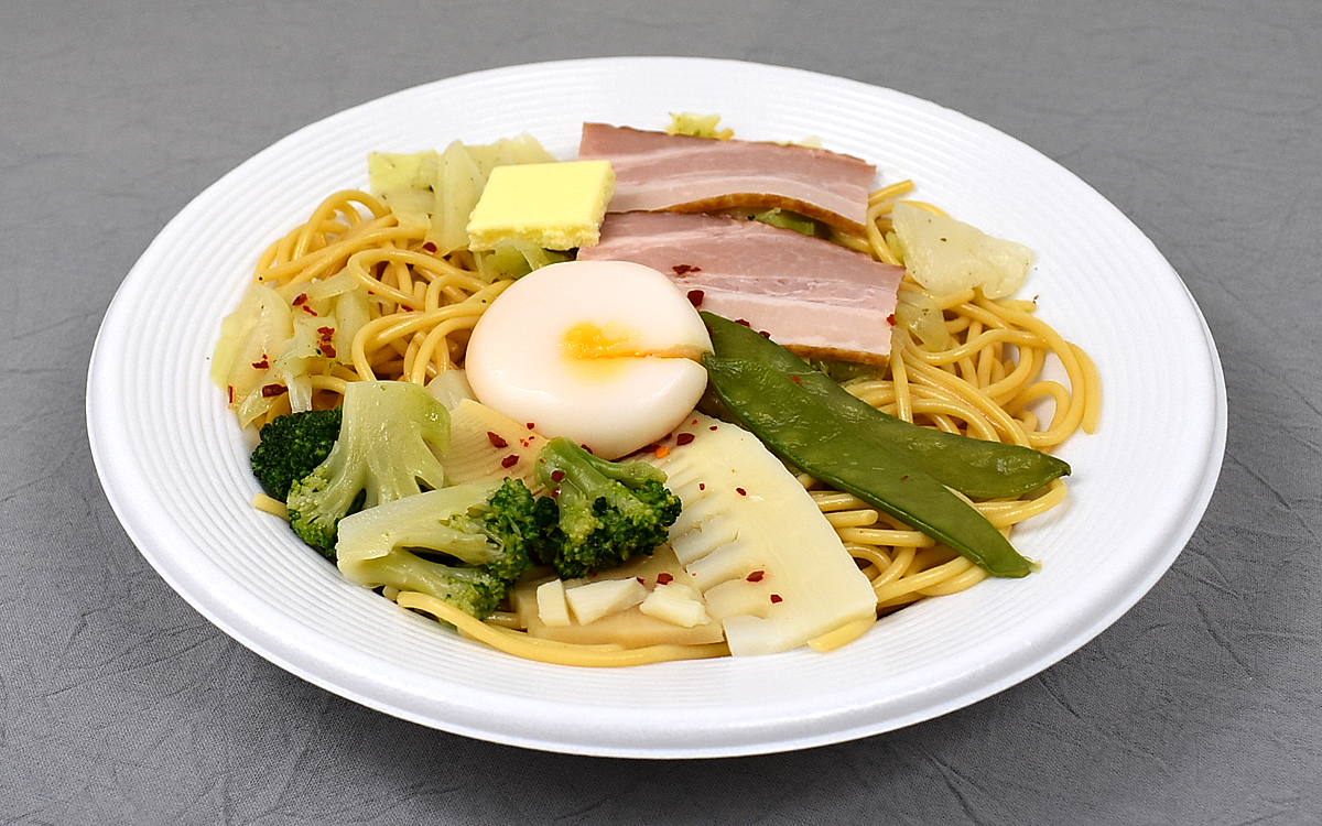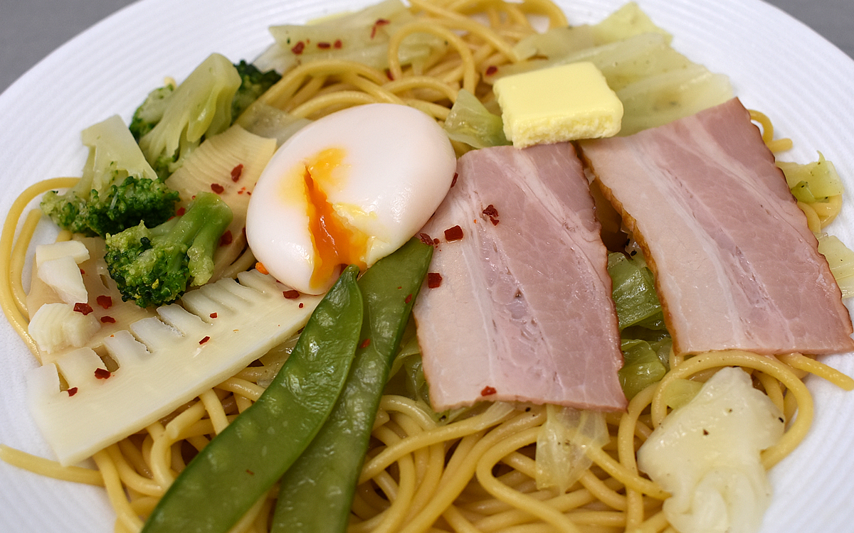 バター醤油味のパスタもさることながら、「Googeous! 野菜! ベーコン!~バター醤油~」の主役は、やはり色とりどりの野菜たち。筍と絹さやはシャキシャキとした食感が残っていて、歯ごたえも楽しむことができます。さらにキャベツは唐辛子でピリ辛に味つけされており、キャベツだけで食べても絶品。野菜の旨味が存分に活かされた本格パスタを530円でいただけるなんて、数あるコンビニパスタの中でもかなりお得と言えるでしょう。