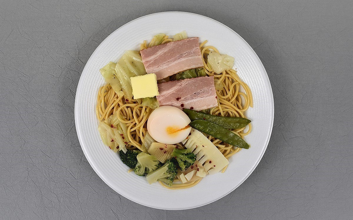 名前の通り、パスタの上にはキャベツ、ブロッコリー、筍、絹さやなどの野菜がたくさん。さらに大きなベーコンが2枚も乗っていて、目にも美味しい華やかパスタに仕上がっています。さっそくひとくち食べたところ、バター醤油のこうばしい香りが口いっぱいに広がりました。