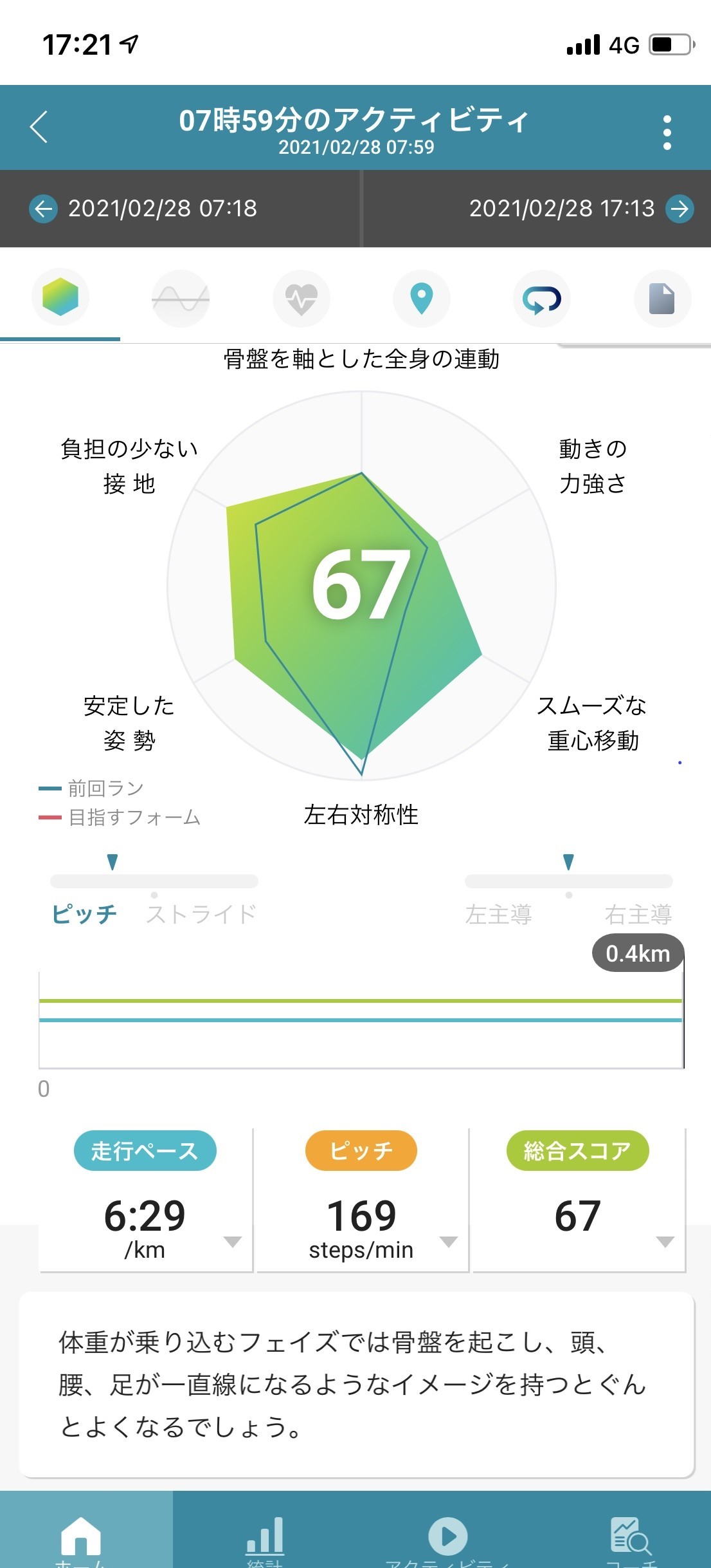 「モーションセンサーで得た情報を、分析データとして分かりやすく表示してくれるのはもちろんですが、下の写真のように『体重が乗り込むフェイズでは骨盤を起こし、頭、腰、足が一直線になるようなイメージを持つとぐんとよくなるでしょう』と表示され、具体的な改善点としてフォームの修正に役立てることができそうです。