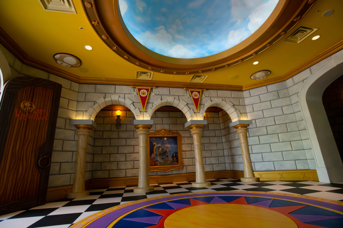 ピーチ城のエントランスにつながっていました! 流れている音楽は、「スーパーマリオ64」のBGM。ゲームファンが泣いて喜ぶ仕掛けも満載なので、ぜひ細かい部分までチェックを。