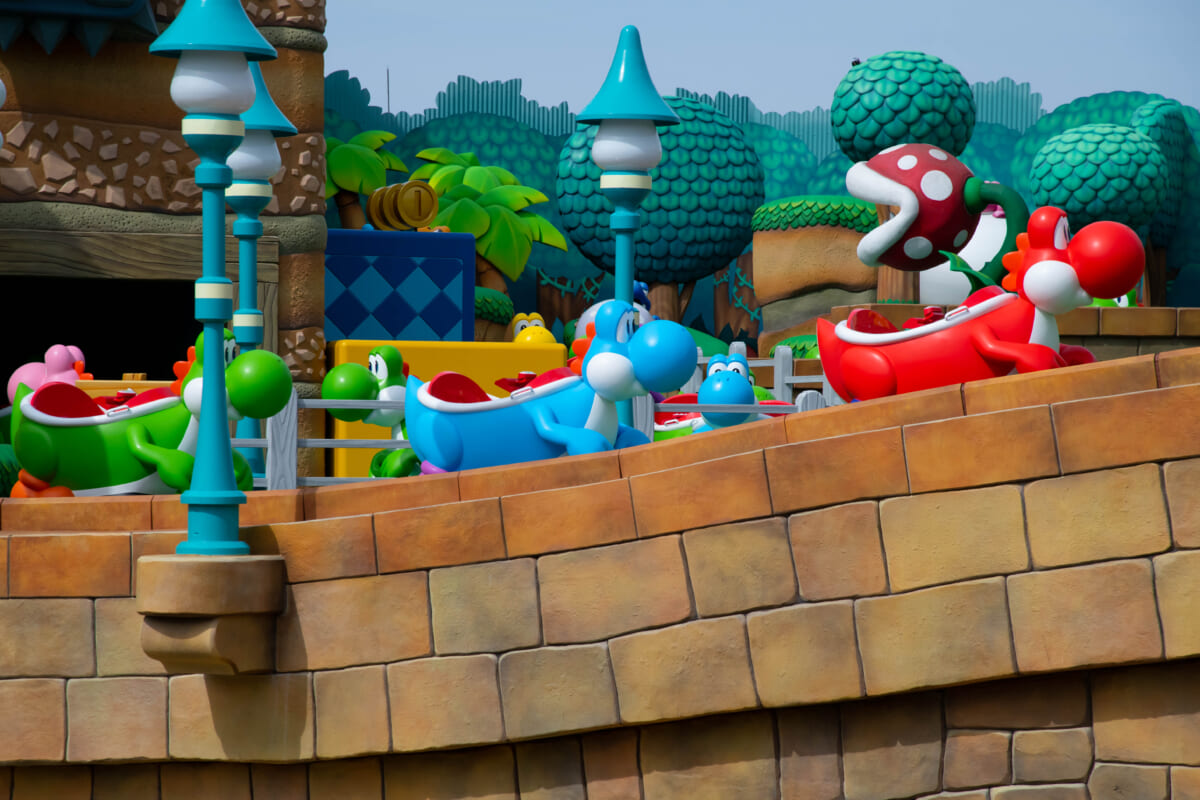 こちらは、86cmの子どもから乗車できる(単独乗車は122cm以上)「ヨッシー・アドベンチャー」。ヨッシーの背中に乗って、お宝探しの冒険に出発します。エリア全体が見渡せるので、親子で絶景を楽しめるアトラクションです。