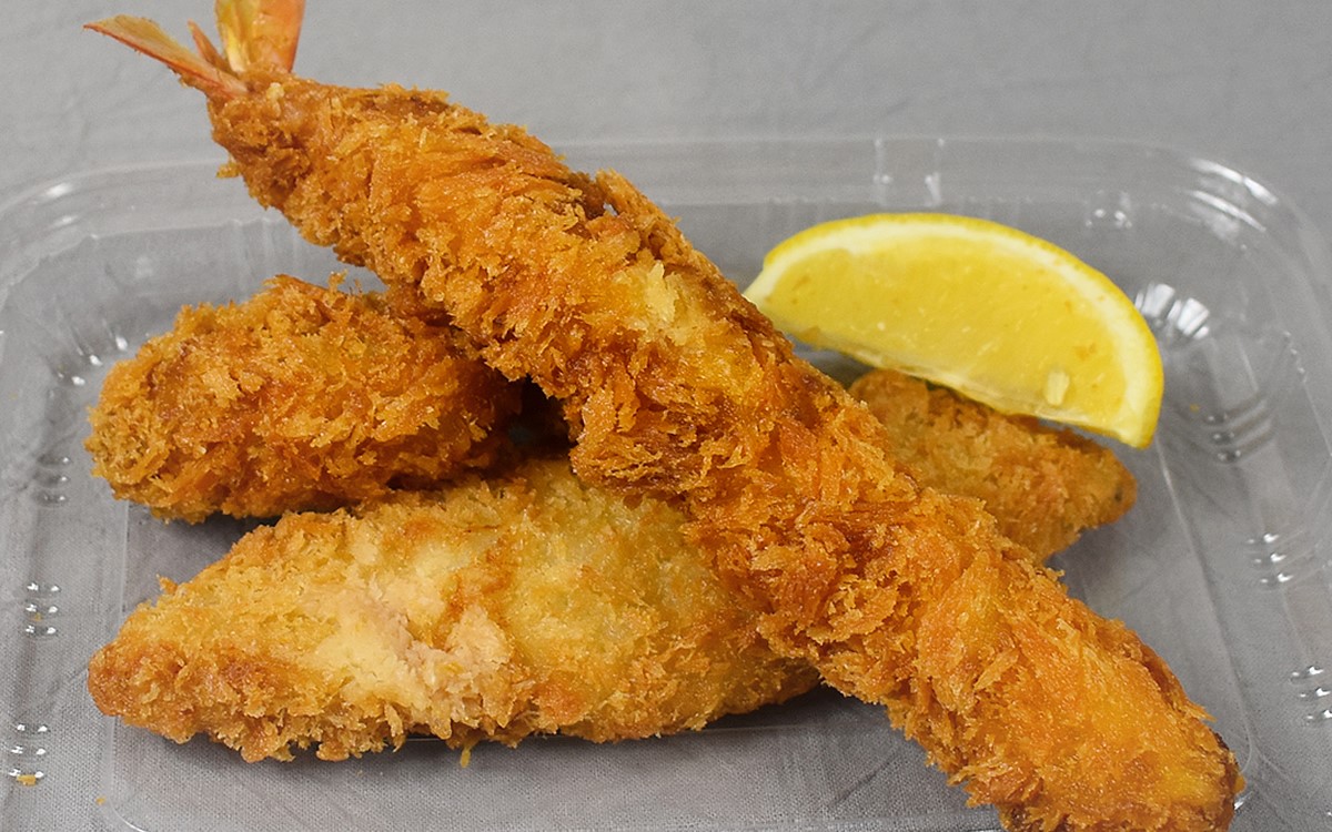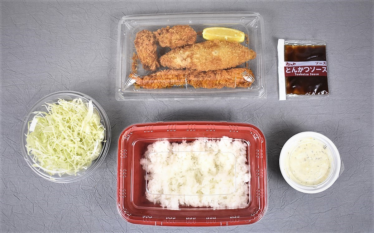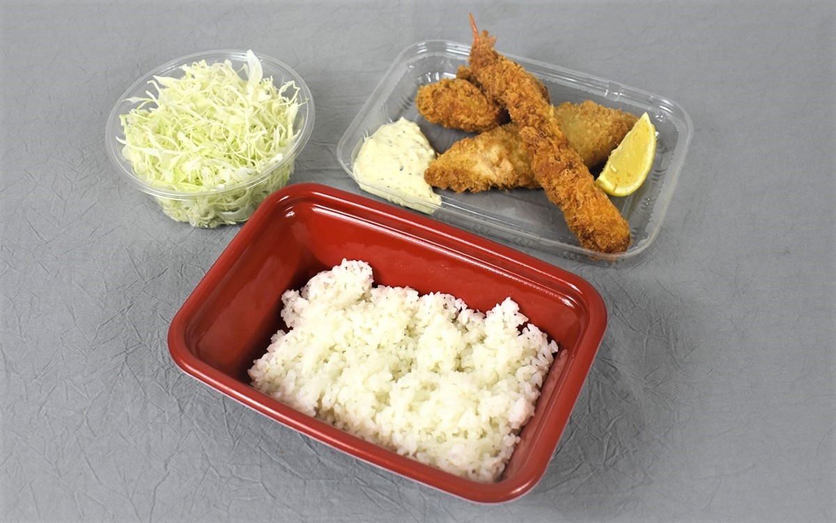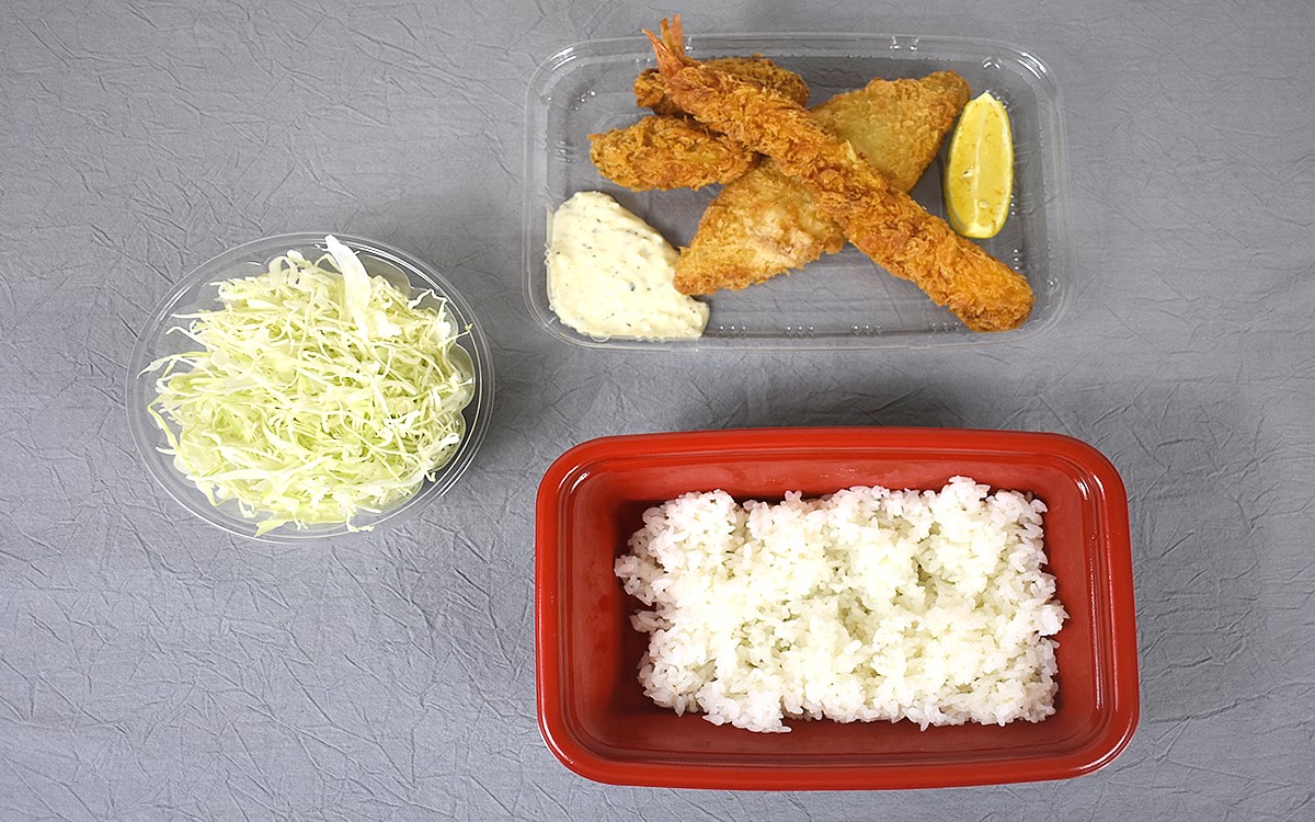 「海鮮盛合わせ定食」は白身フライと海老フライ、そして牡蠣フライの海鮮系フライ3種類が贅沢に味わえる商品です。それではさっそくそのお味を確かめていきましょう。