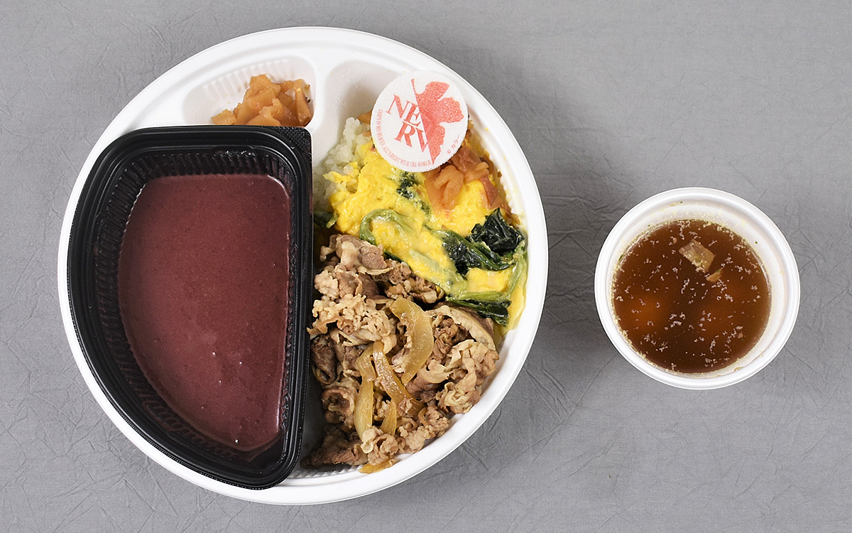 ●「初号機オム牛カレー オニオンスープセット」(すき家)