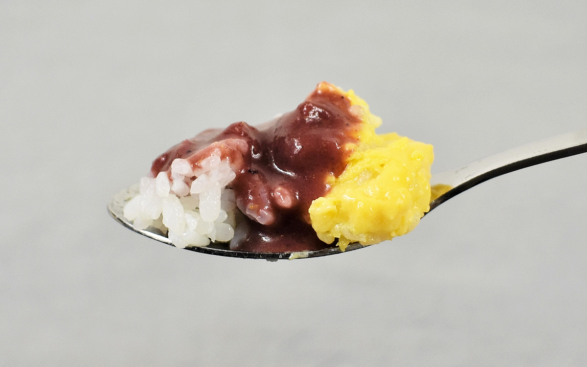 見た目だけでファンを魅了した同商品ですが、“紫のルー”が少し毒々しい……。意を決してルーを口に入れると、想像以上にスパイシーでコク深い味を感じました。スパイスの種類や量の微調整を繰り返し、少し辛めの濃厚味を実現したそう。ちなみに紫色はクチナシやビーツなどで色をつけているのだとか。