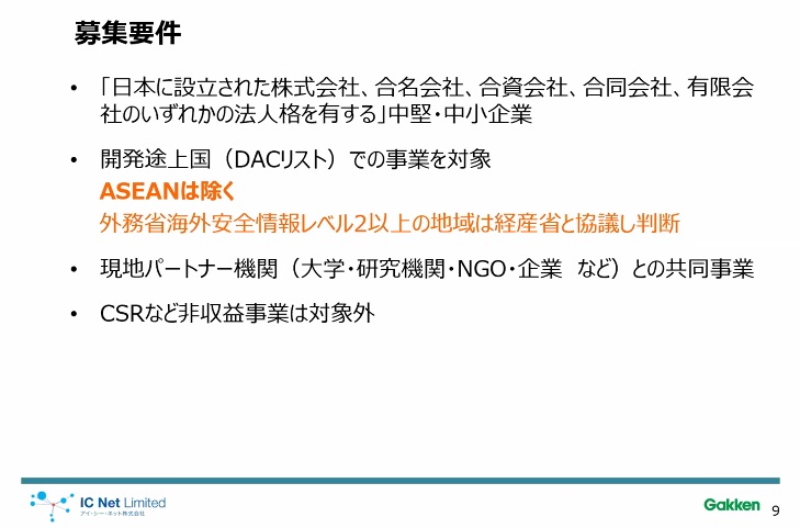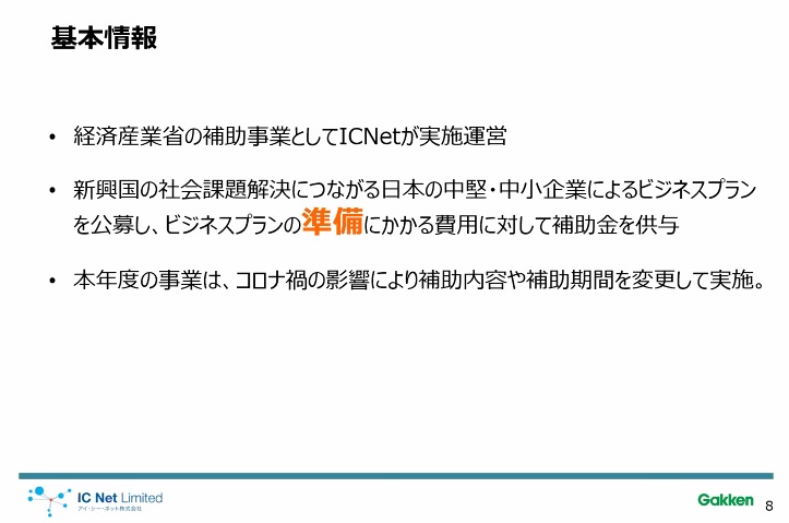 アイ・シー・ネットが主催している「飛びだせJapan!」プロジェクトは、日本の中小企業が新興国で社会解決につながる海外展開を行う際に、企業にコンサルティングを行うとともに、製品・サービスの開発などに必要な経費を一部補助するもの。経済産業省の「技術協力活用型・新興国市場開拓事業費補助金(社会課題解決型国際共同開発事業)」を受けて実施されています。