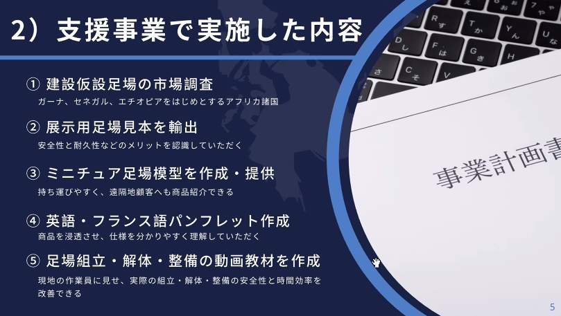 同プロジェクトの補助を受けて実施したのは、現地における建設足場の市場調査や、展示用見本の作成および輸出、英語・仏語パンフレットの作成など。