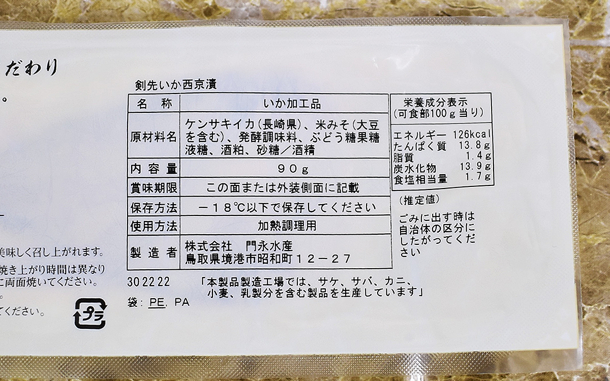 鳥取県境港市に本社と工場を置く「門永水産」は、加工品や漬魚の製造に特化したメーカー。取り扱う商品は全て同社の工場で作り上げ、素材の味を活かすため保存料や着色料は一切使用していません。ちなみに今回のケンサキイカに使われている西京漬は、門永水産オリジナル。ふくよかな甘みを持つ白荒みそを配合しており、一般的な西京漬よりも上品な風味を楽しめます。