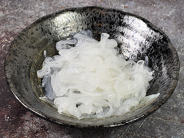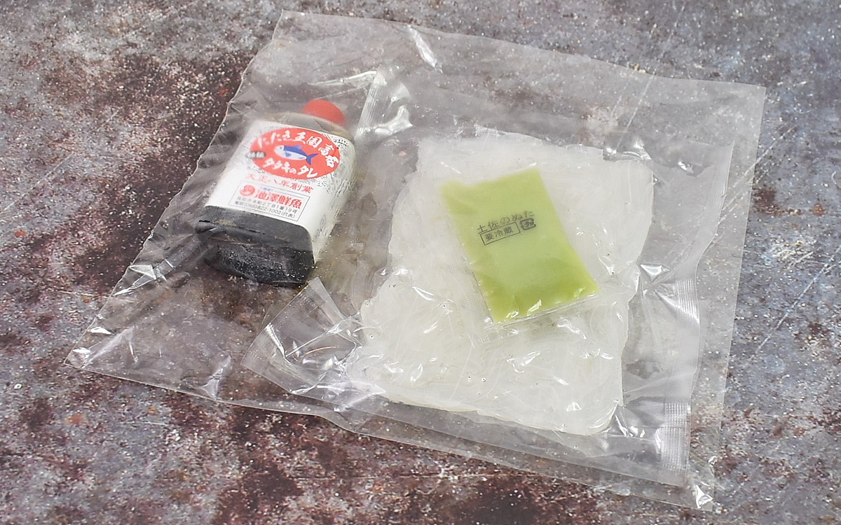 ノレソレ(100g)と特製タレがセットになった同商品。パックにぎゅっと封入されたノレソレは半透明で、まるで“いかそうめん”のようです。
