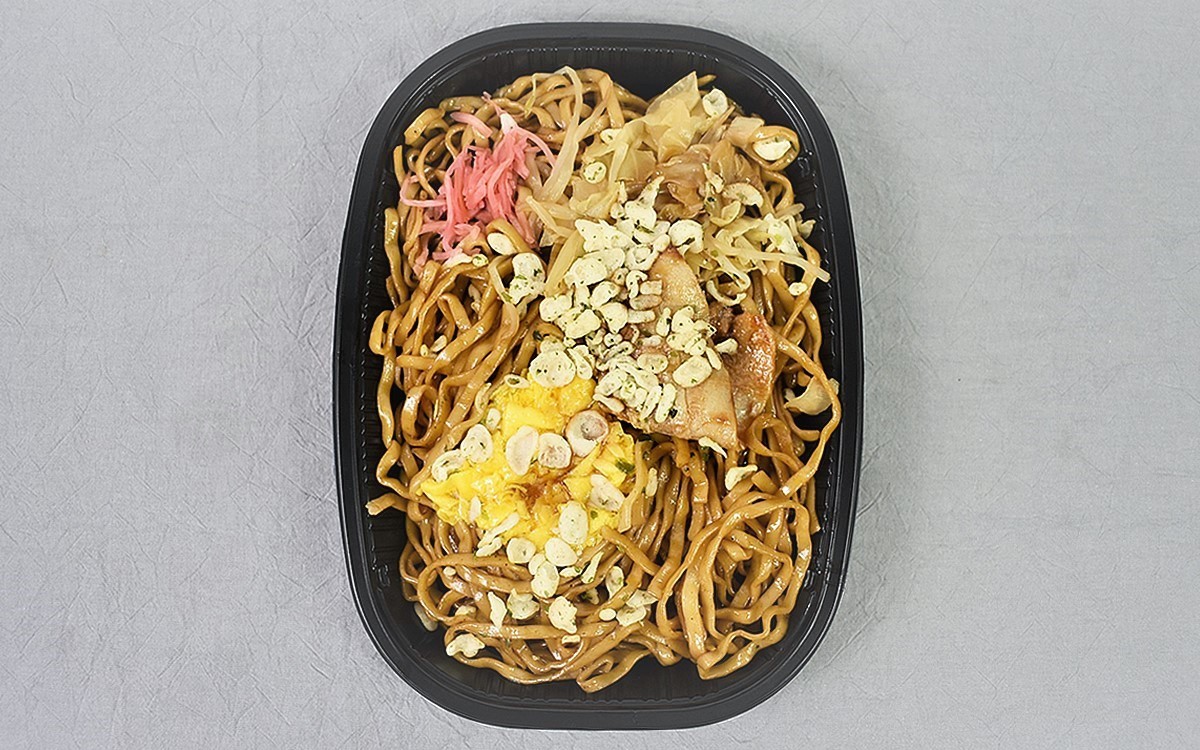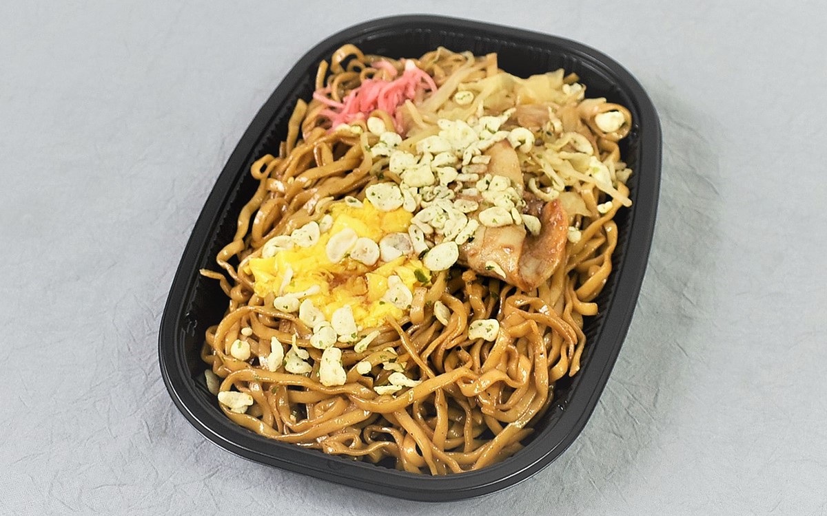 それでは、さっそく商品をチェックしていきましょう。麺には平打ち特製麺が使用されていて、従来のやきそばとは印象が異なります。また豚肉・もやし・キャベツに加えて、玉子や天かすが入っているのも珍しいですよね。
