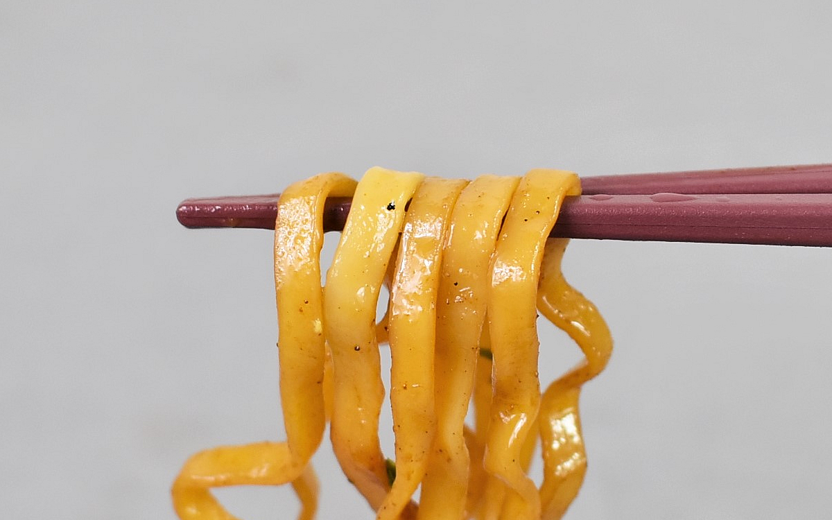 まずは麺からいただいてみたところ、もっちりとした食感にびっくり。やはり従来の麺とは弾力が違い、噛めば噛むほど堪能できる歯ごたえがGOOD。平打ち麺特有の食べごたえもあり、がっつりお腹を満たしてくれます。