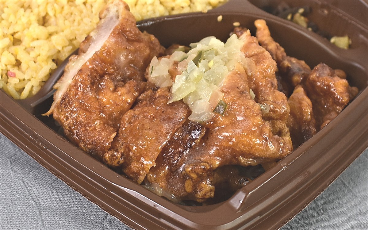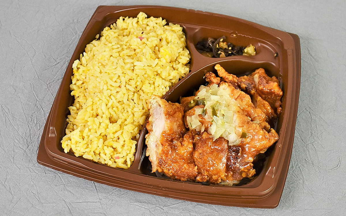 「まんぷく!」というだけあってボリューム満点なのは一目瞭然。手に持ったときのずっしりした重量感に期待が高まります。蓋を開けてみるとたっぷりの炒飯と大きめカットの油淋鶏がドン!これはインパクト抜群ですね。