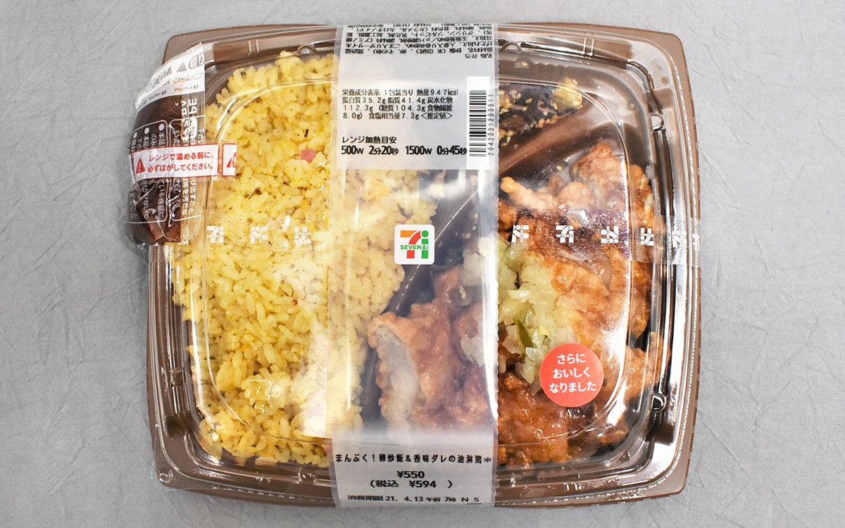これまでもクオリティーの高い中華惣菜を多数発売してきたセブン-イレブン。同店のお弁当にはたくさんのファンがいますが、またまたファンの間で話題になりそうな商品を発見しました。今回見つけたのは、具材がぎっしり詰まった中華弁当「まんぷく!卵炒飯&香味ダレの油淋鶏」(594円/税込)。中華をがっつり食べたい時にぴったりな一品です。