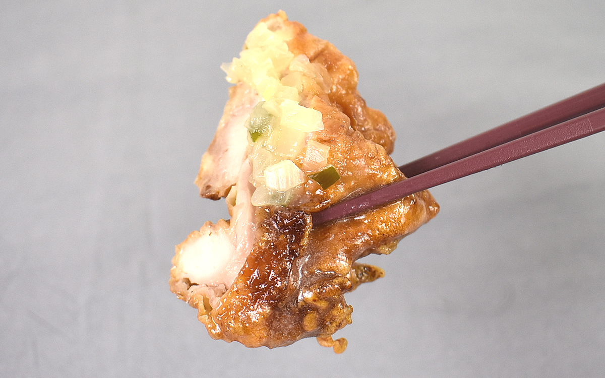 まずは、ほどよく下味がついたジューシーな油淋鶏をいただきます。大きく口を開けてかぶりつくと、肉の脂がじゅわりと染み出てきました。別添えの香味ダレを絡めると、すっきりした甘酸っぱさで食欲が増幅されます。ねぎもしっかりお肉の上に乗っかっているので、シャキシャキ食感を同時に楽しむことができますよ。