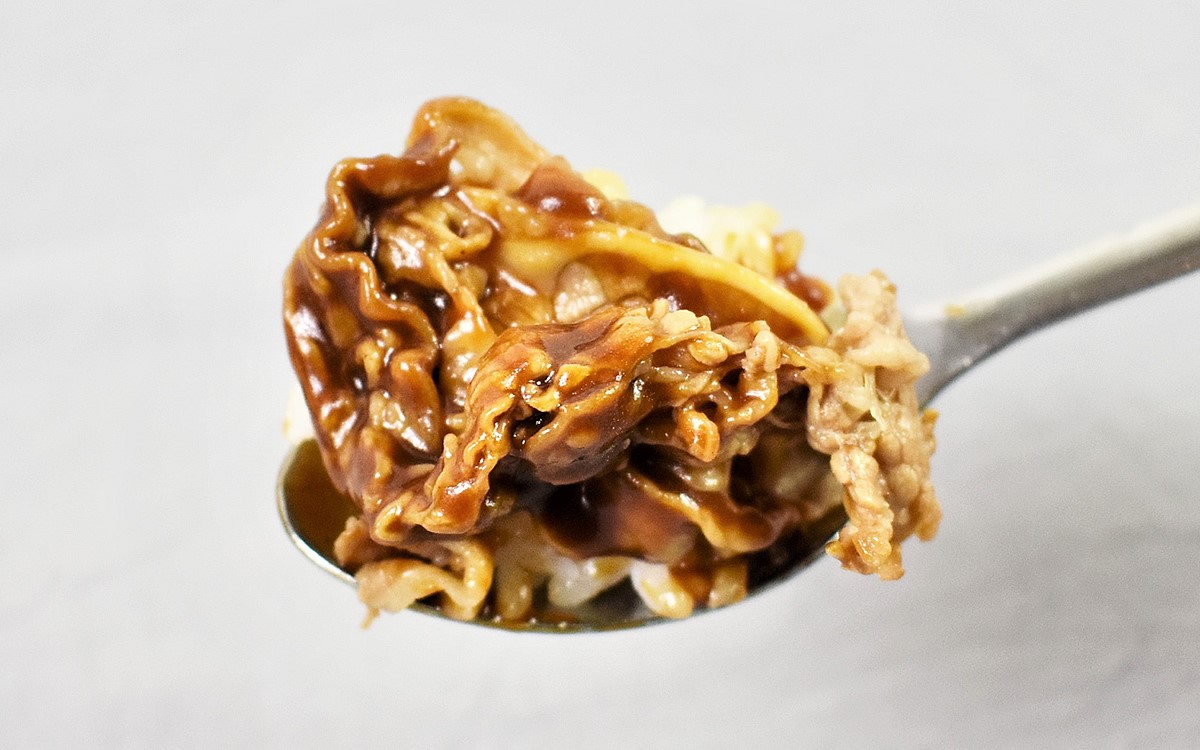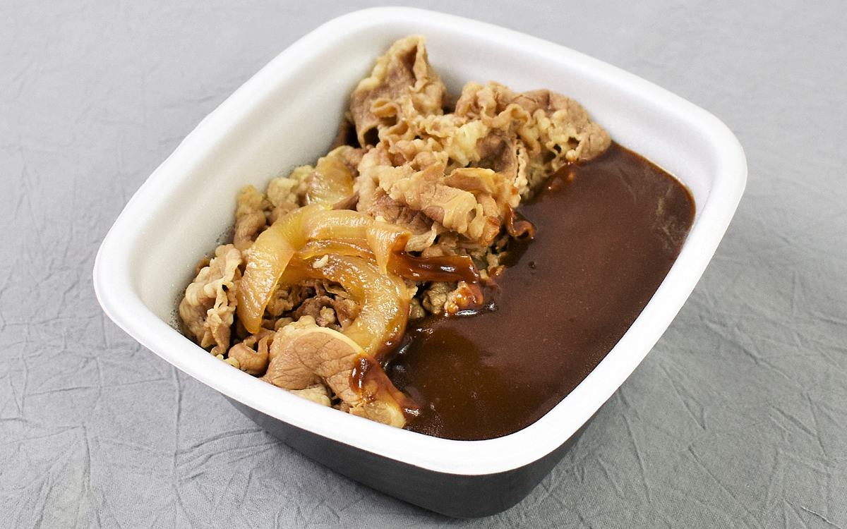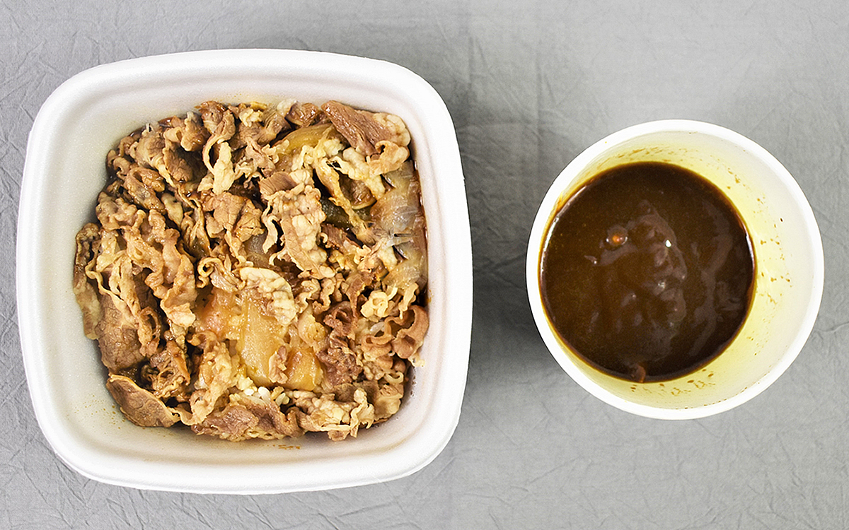 パッケージの蓋を開けると、牛丼の肉々しい香りとカレーの刺激的な香りが。ご飯を埋め尽くす牛肉のボリュームに、食欲が掻き立てられました。