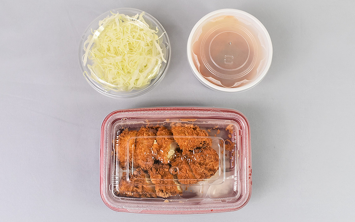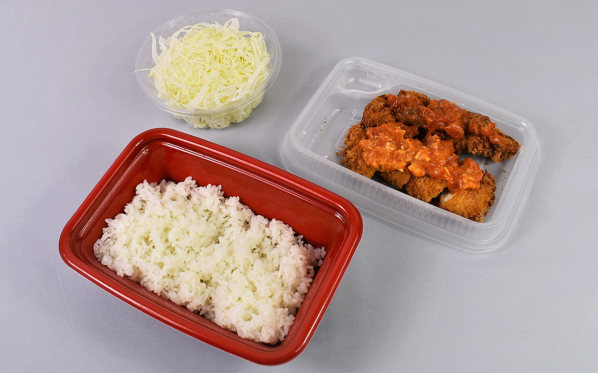 テイクアウトで購入すると、トマトソースが別添でついてきます。ご飯を覆う大きなささみかつにたっぷりかけて、さっそくいただいてみましょう。