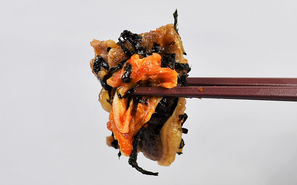 はじめにキムチだけを食べてみましょう。唐辛子のピリッとした辛味が舌を刺激しますが、後を引かないさっぱりとした味わい。辛味だけでなく甘みと酸味もバランスが良いため、辛いものが苦手な方でも食べやすいキムチです。これだけで白ご飯が何杯でも食べられそう。