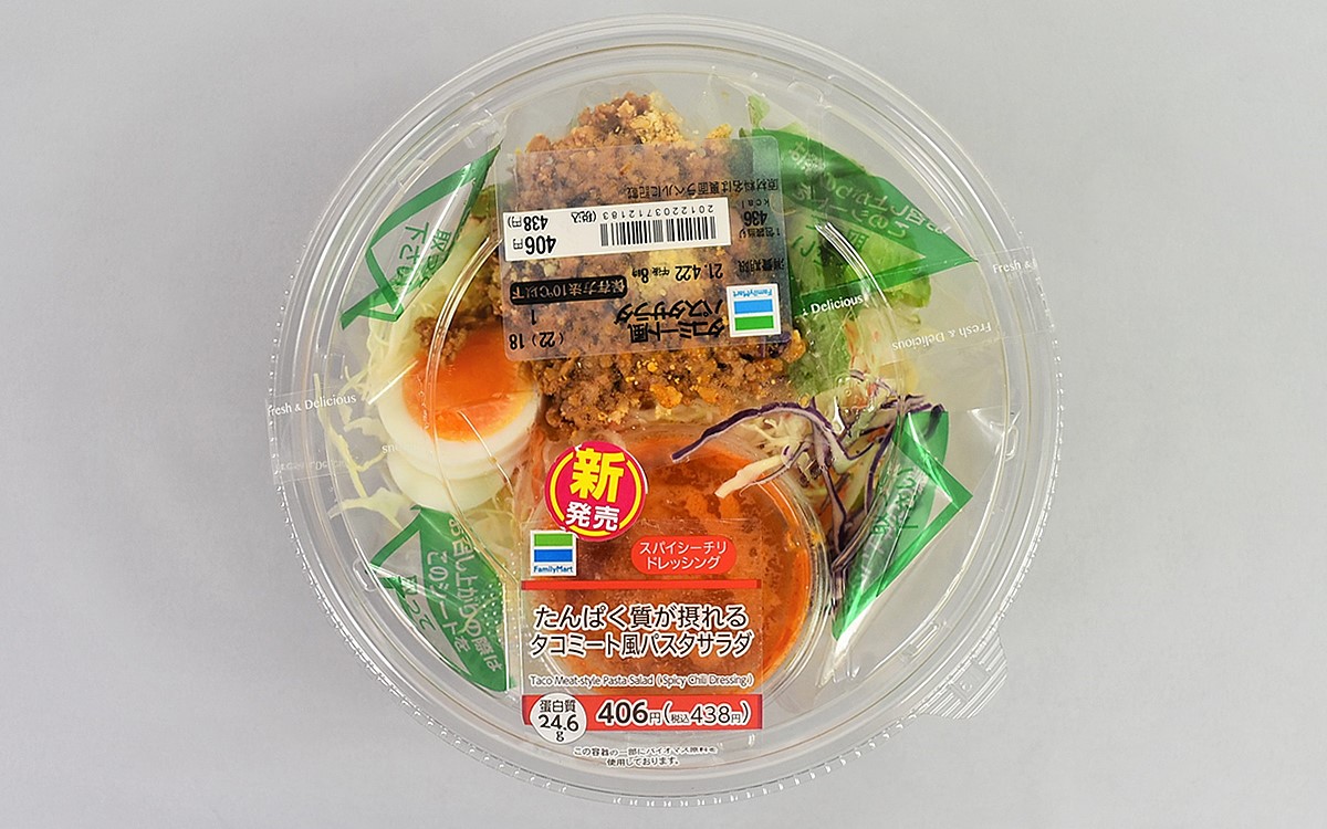 暑くなると、スパイシーなものを食べたくなりますよね。そんな時、目に留まったのがファミリーマートの「たんぱく質が摂れる タコミート風パスタサラダ」(438円/税込)です。“タコミート風”のクオリティーが気になるところですが、“たんぱく質が摂れる”という点が注目ポイント。どのような味わいなのか、さっそくレビューしていきましょう!