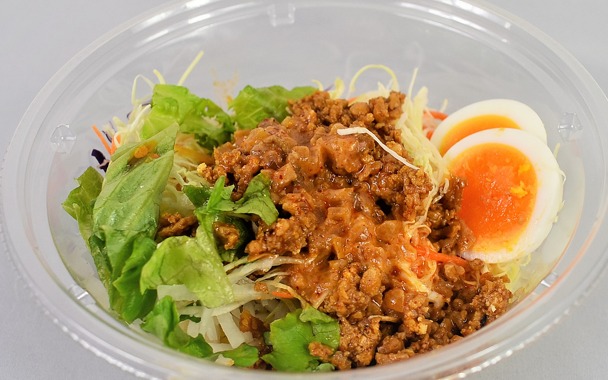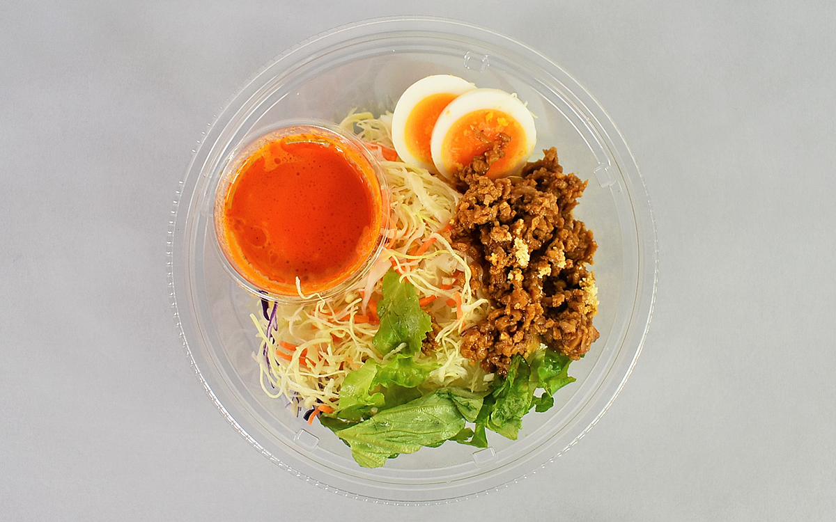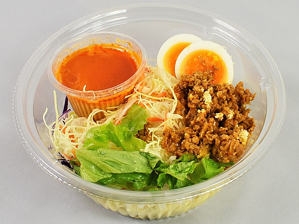 タコミートとは、ひき肉をスパイスで煮込んだもの。メキシコ料理のタコスや、沖縄料理のタコライスに使われているのが有名です。同商品はパスタの上にタコミート風のそぼろと野菜、ゆで卵がトッピングされて彩り鮮やか。カップ入りの「スパイシーチリドレッシング」をかけていただきます。