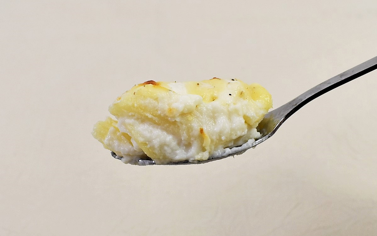 グラタンの底に敷きつめられたマカロニは、グラタンソースにたっぷり絡めていただきましょう。グラタンソースにはピリッと胡椒が効いていて、クリーミーなチーズとベストマッチ。特に焼き目がついたソース部分からはこうばしさが感じられ、チーズの香りを引き立ててくれます。