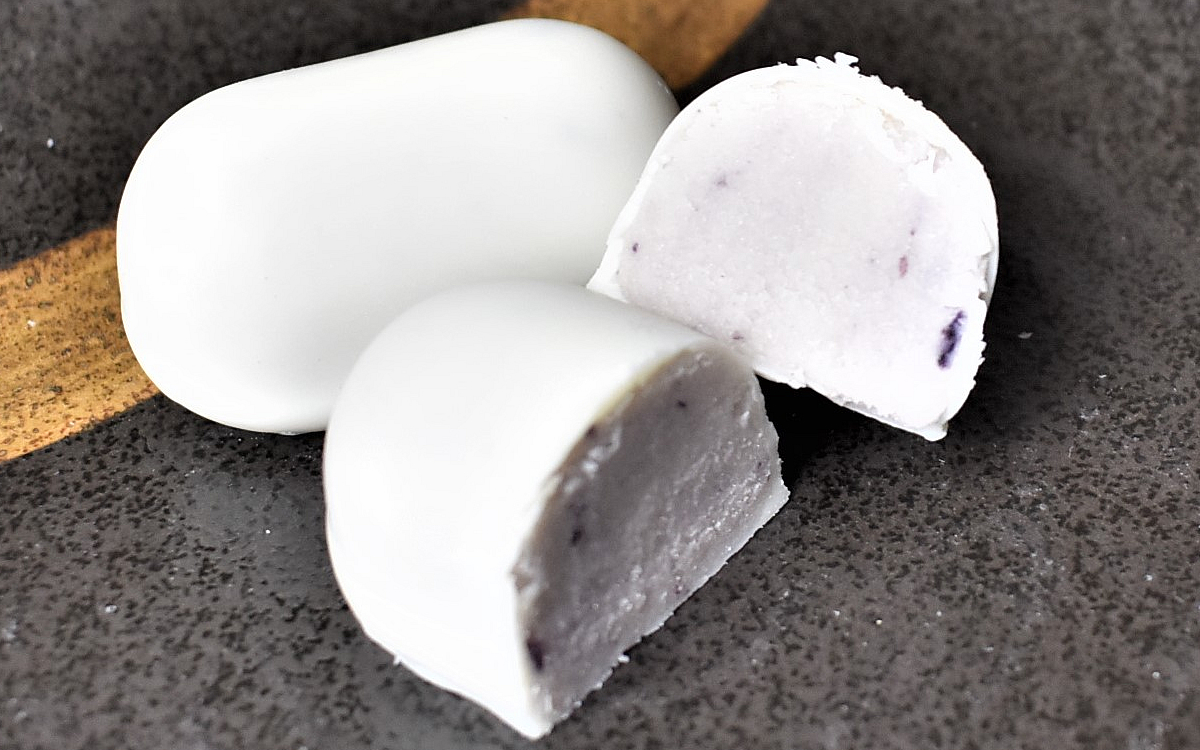 同商品のホワイトチョコレートはまるで生クリームのようなクセのない味が印象的。酸味のあるブルーベリー果肉が混ざった「ぶるーべりー巣ごもり」の餡とは特に相性抜群で、まろやかでコク深い味わいが生まれています。