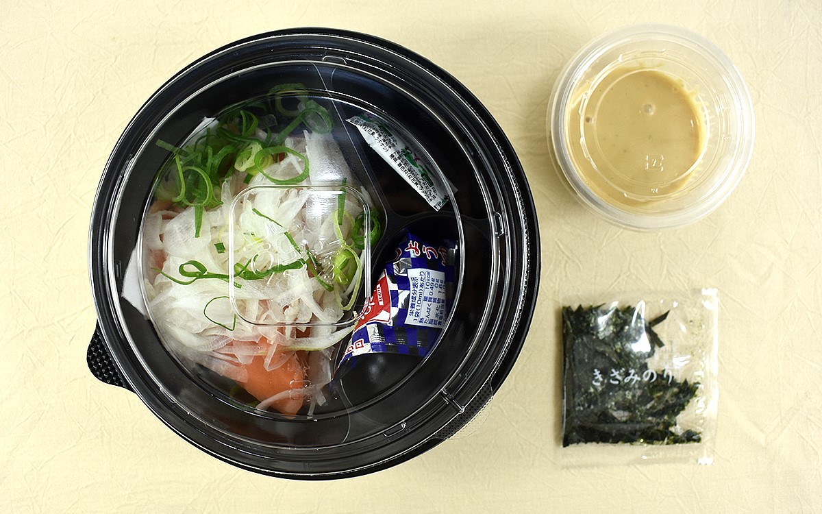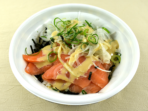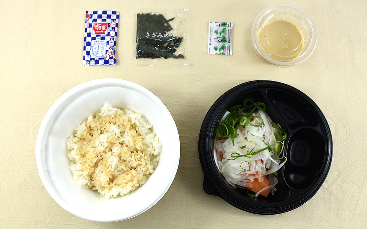 具材とご飯が分けられてパッケージに入っている同商品。全てトッピングしてみると、サーモンとスライスオニオンでご飯が見えなくなるほどボリューミーです。別添えの“わさびマヨ”と“きざみのり”、そして“だししょうゆ”をかけていただきます。