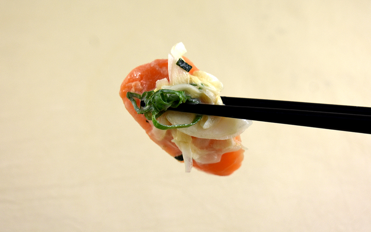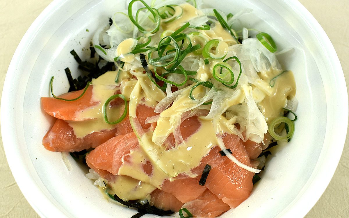 まずは、肉厚なサーモンを一切れ食べてみたところ、上質な脂の旨味が口いっぱいに広がりました。甘みが強く、塩気の効いた“だししょうゆ”とベストマッチ。スライスオニオンはシャキシャキした食感が楽しく、ぷりっと弾力のあるサーモンと一緒に食べると2つの歯ごたえを堪能することができます。甘じょっぱい味つけなので白米との相性も抜群。ねぎやきざみのりの風味もプラスされて、飽きることなく食べ進められます。