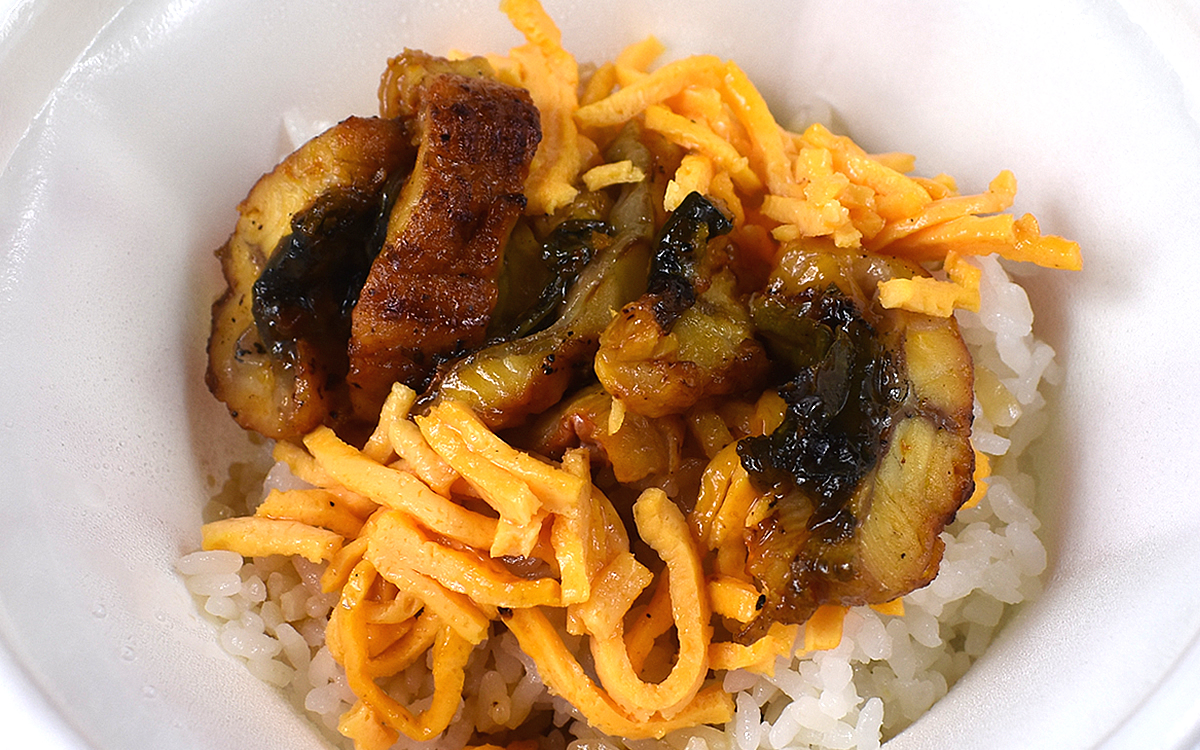 セパレート式になっている具材をご飯に盛りつけて、早速頂いていきましょう。まずは、うなぎから食べてみると、ふわふわの食感に驚きました。ふっくらと焼き上げられたうなぎはあっという間にほどけ、口の中にはこうばしい香りが広がります。美しく照っているタレは、食欲の進む甘い味つけ。タレに付けて焼く工程を3度繰り返しているため、うなぎの身にしっかり味が染みていて絶品です。