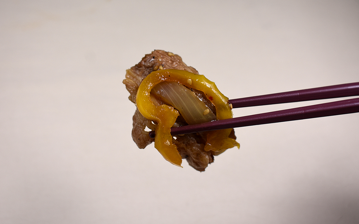 主役は牛肉だけではありません。たっぷり入ったパプリカと玉ねぎも、食感を楽しめるざく切りサイズ。鉄板で炒めているため、シャキシャキの歯ざわりをしっかり感じることができました。