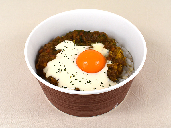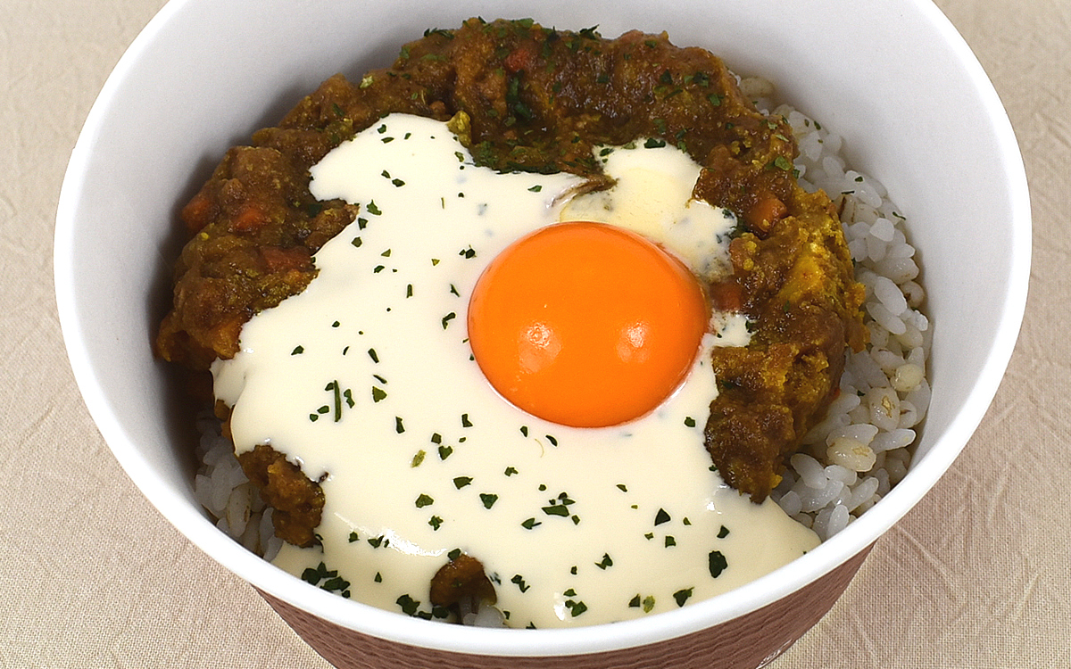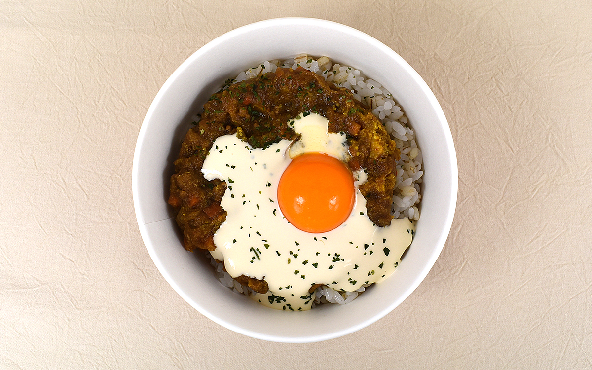キーマカレーの上にトッピングされているのは、トロっと溶けたチーズと卵黄ソース。まるでおしゃれなカフェで出てくるカレーのような豪華さです。特にきれいなオレンジ色の卵黄ソースが目を引きますが、一体どんな味わいなのでしょうか。