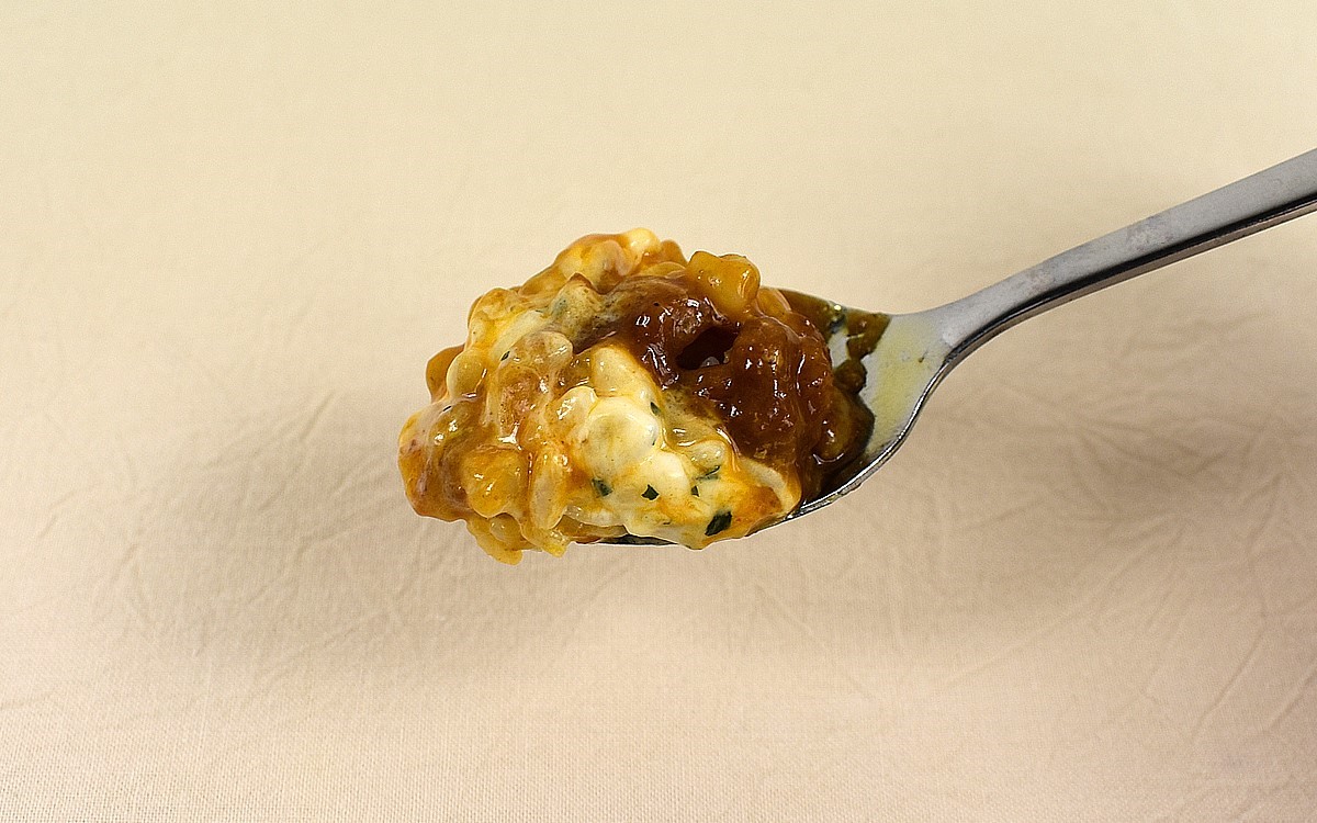 まずは、チーズと卵黄ソースを避けて、キーマカレーのルーだけを食べてみることに。すると、香辛料のピリッとした辛味が舌を刺激し、夏にピッタリのスパイシーな味つけを楽しめました。また、細かく刻まれた人参や玉ねぎのシャキシャキした食感もたまりません。