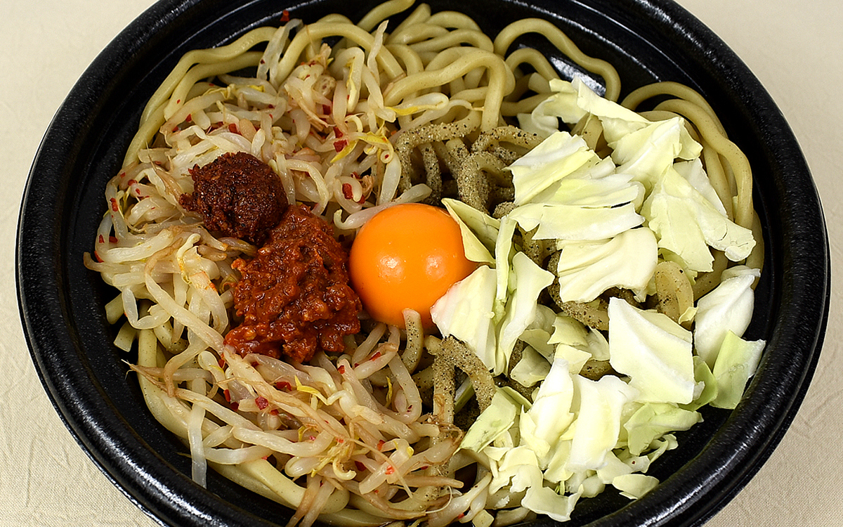 弾力のある極太麺にもこだわりが詰まっています。特製辛味玉やたれがよく絡み、旨味を逃がさないモチモチの食感が特徴的。シャキシャキとしたキャベツやもやしとの相性も最高です。