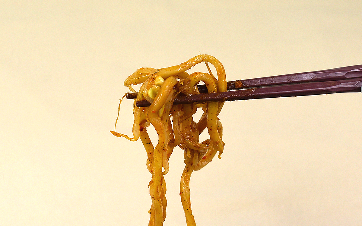 東京都内に15の店舗を構えるラーメン店「麺屋武蔵」。同店は鶏ガラと豚骨を主体としたスープと、かつお節・煮干しでとる「魚介系スープ」のダブルスープからなる「二刀流スープ」で評判です。今回紹介する「辛真剣そば」も、こだわりの豚骨魚介だれが楽しめる商品。温めると豚骨と魚介の強い香りが漂い、食欲が掻き立てられました。