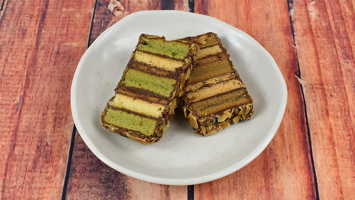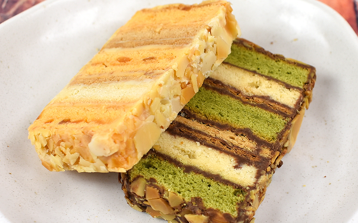 季節を問わない通年商品が4種類、期間限定商品1種類がセットになっている同商品。どの味にも共通しているのは、3つの生地が層になることで生まれる独特の食感です。サクサク食感のクッキー生地とパリパリのパイ生地、しっとりしたスポンジ生地が重なっていて見た目も鮮やか。口の中でクッキー生地とパイ生地がほろっと崩れたかと思うと、スポンジ生地のなめらかな舌触りが存在感を増していきます。トッピングされたスライスアーモンドのこうばしい香りもアクセントになり、上品な甘さを引き立てていました。