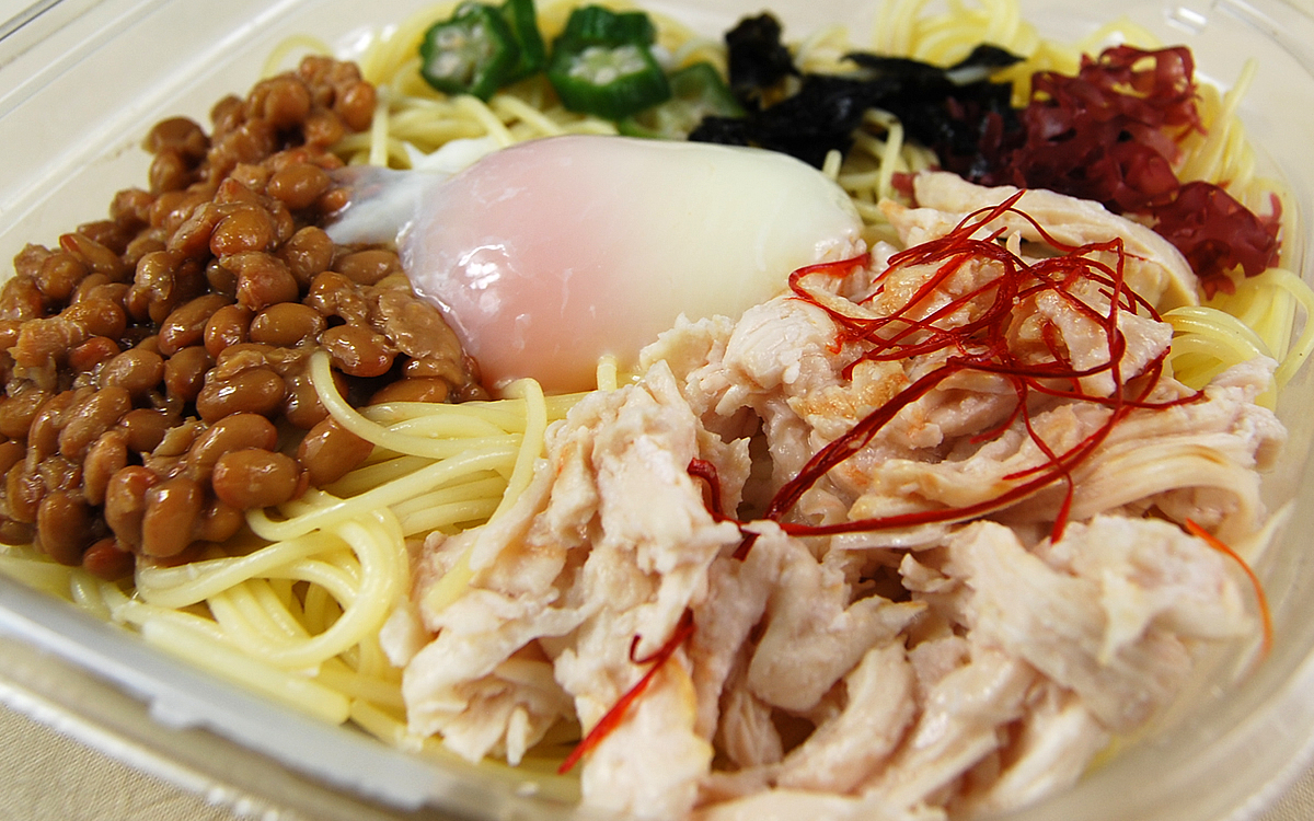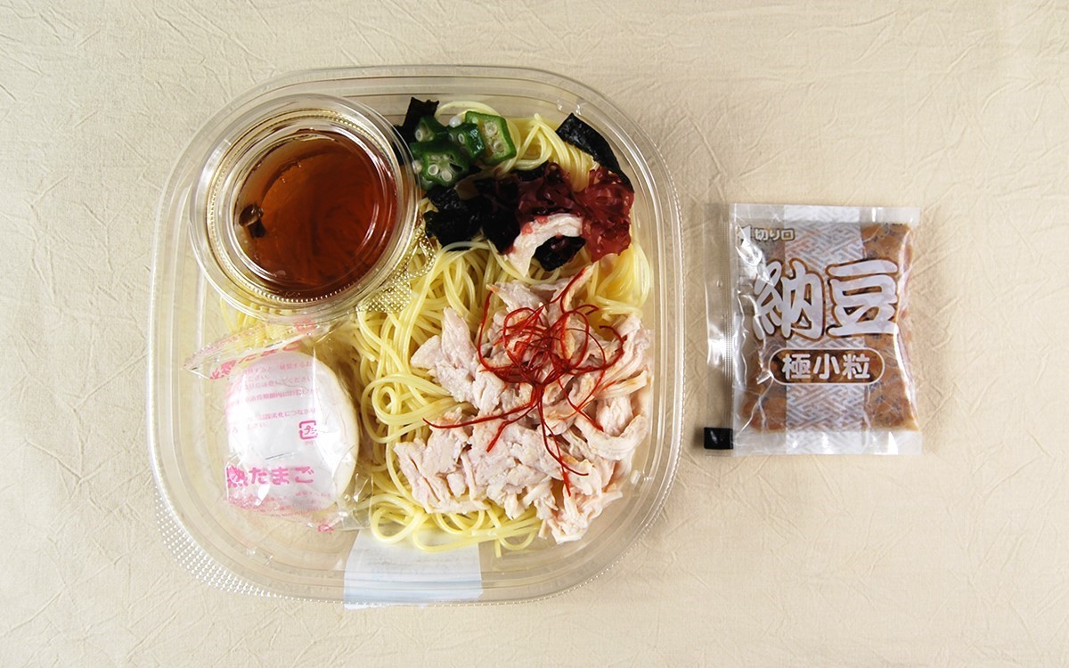 同商品には“健康メニュー”としての側面も。たんぱく質豊富な蒸し鶏をはじめ、納豆とオクラには整腸作用があります。さらに海藻には、肌をきれいに保つ効果を持つミネラルも。美容や健康にうれしい食材を一度に摂ることができました。