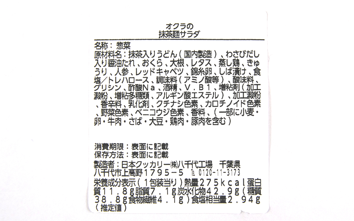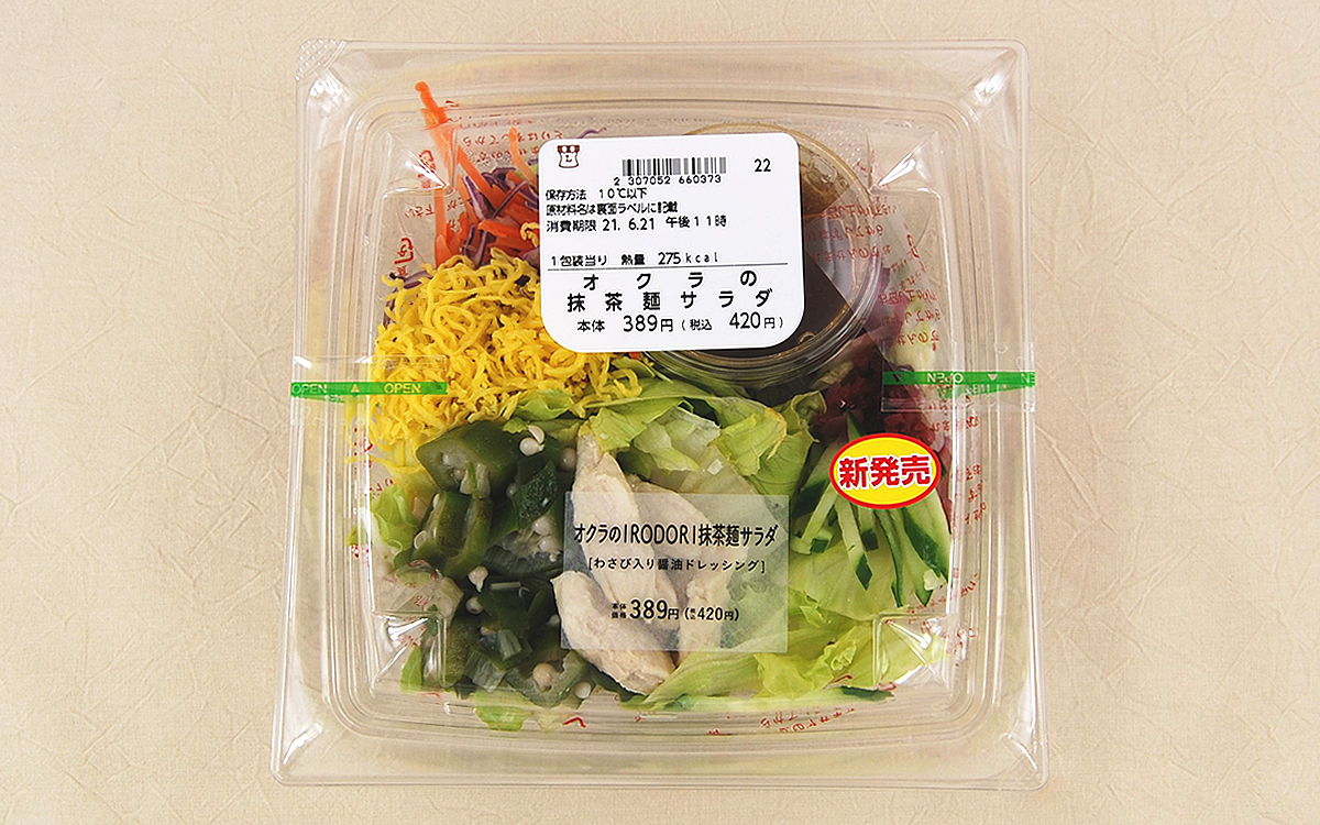 抹茶の香りと野菜の食感が合い、夏らしい爽やかな味わいの「オクラのIRODORI抹茶麺サラダ」。275kcalと低カロリーなのもうれしいポイントですよね。