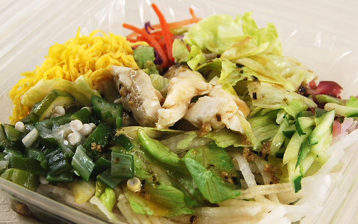 オクラや蒸しどり・しば漬けなどがトッピングされ、商品名の通り色鮮やかな同商品。盛りだくさんな具材の下には、きれいな緑色の抹茶麺が隠れていました。味つけには付属の「わさびだし入り醤油たれ」をかけて頂きます。