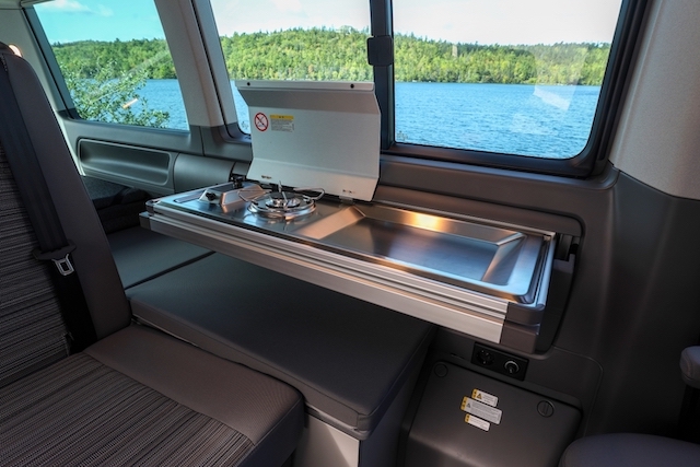 VWのビーチ・ツアーとビーチ・キャンパーの共通点は、縦200cm×横120cmのマットレス付きポップアップルーフや、車外で使える折りたたみ式のテーブルと椅子2脚(バックドアに収納可能)、回転式の運転席と助手席などが標準装備されています。両者の違いは、ビーチ・ツアーはスライドドアが左右両側に付いているため、人の出入りや荷物の出し入れがスムーズにできるのがポイント。それに対して、ビーチ・キャンパーは折りたたみ式のステンレス製作業台と1口ガスコンロのミニキッチンが搭載されており、折りたためば側面に収納することができます。