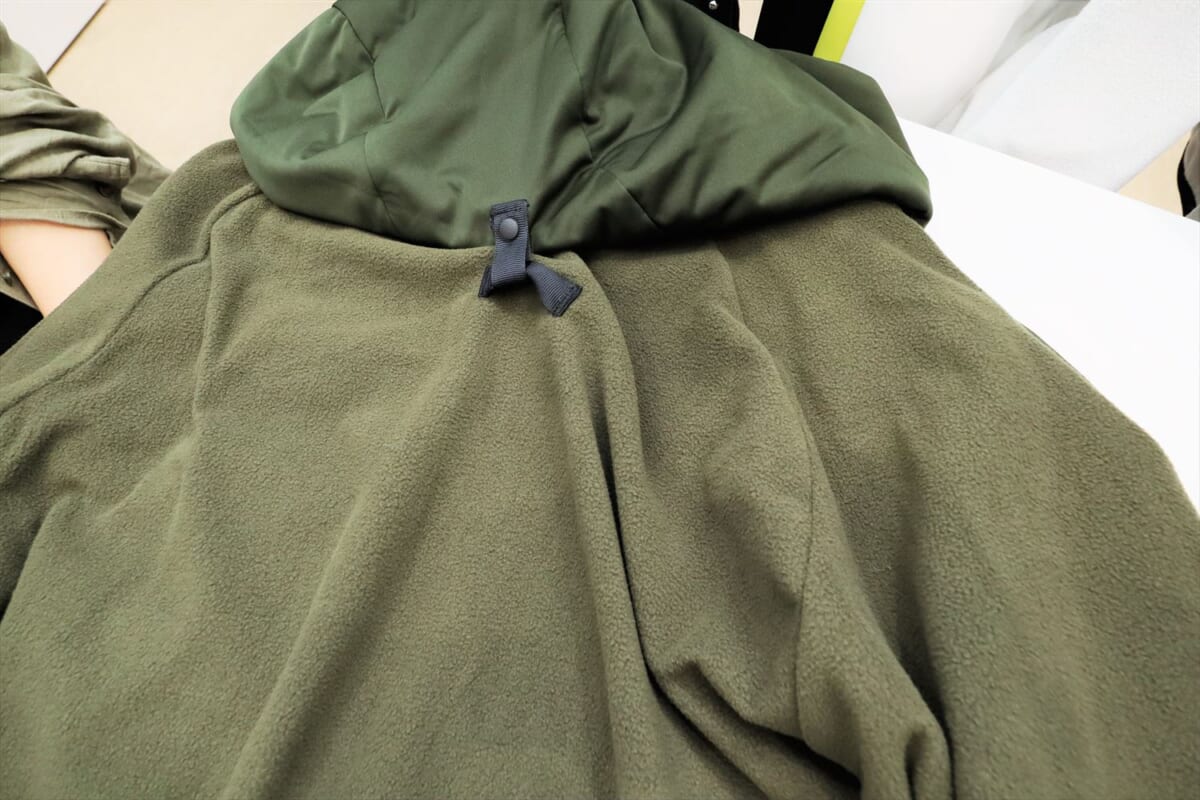 便利だと感じたのがフードストッパー。フードがあるとちょっとした雨の際に頭が濡れずに済むのですが、フードを使わない時は邪魔になります、風に煽られて顔にまとわりついたり、スイングの際に振り子のように左右に揺れ気になったり。ストッパーでフードを止めれば、スイングの際に気なることもないでしょう。