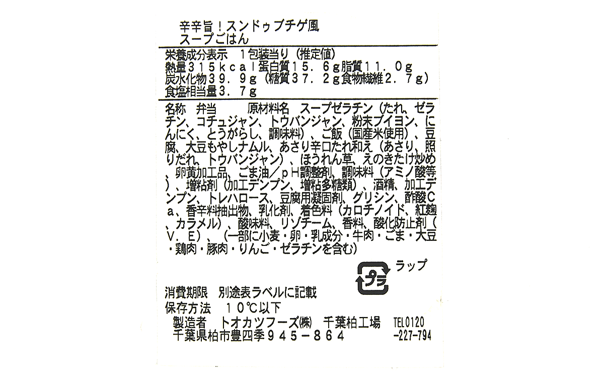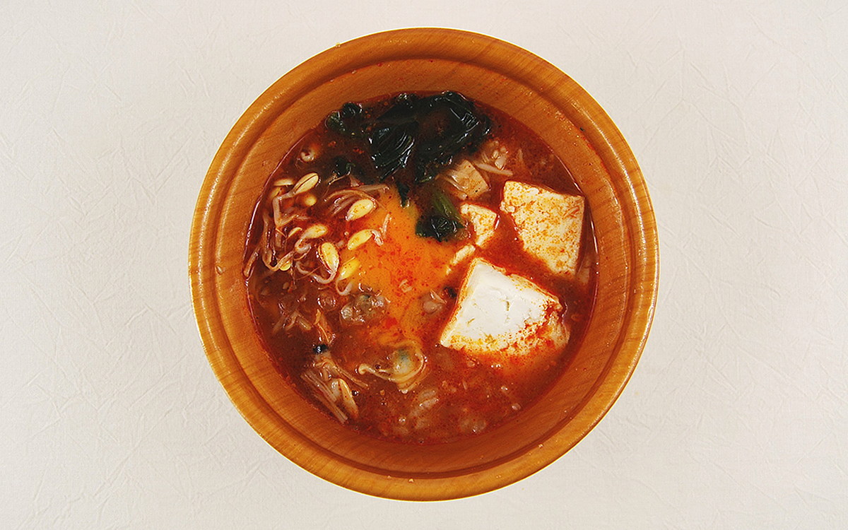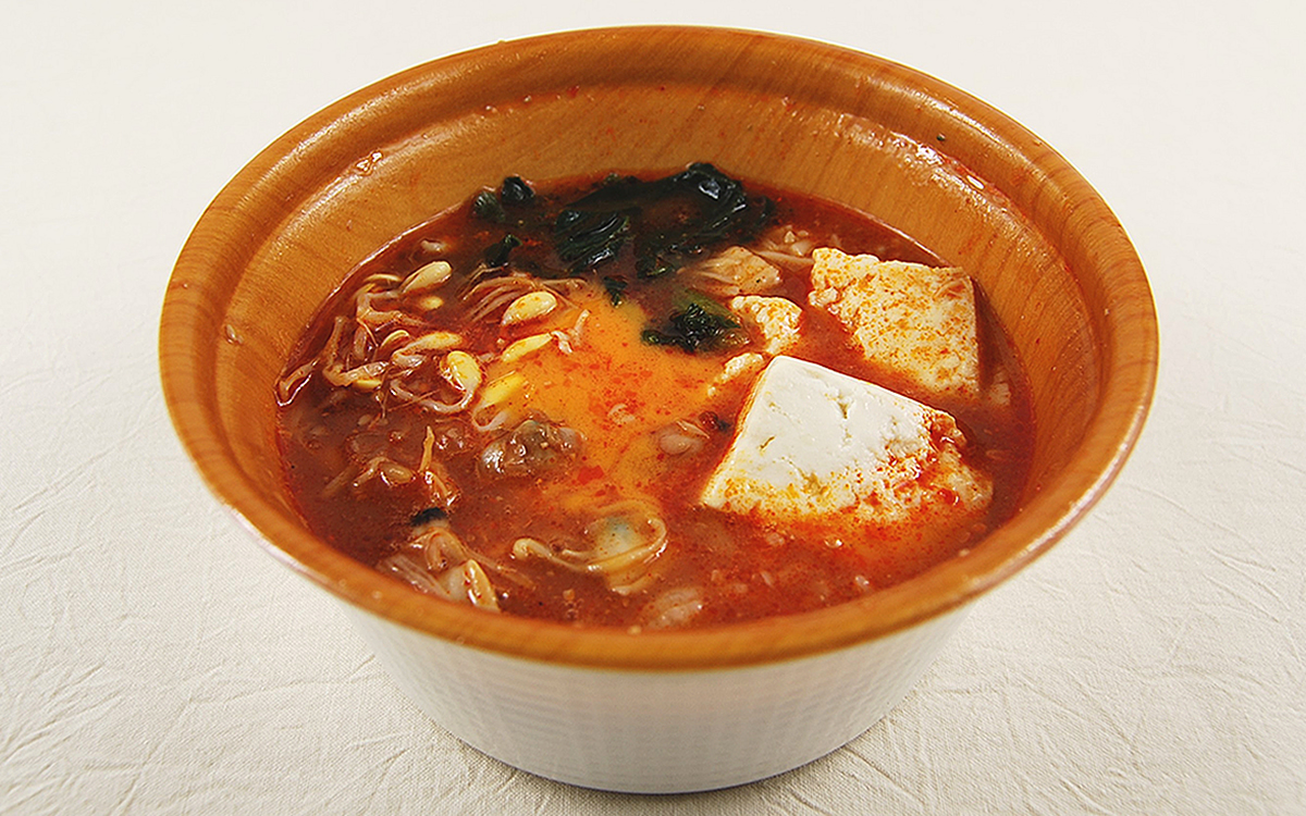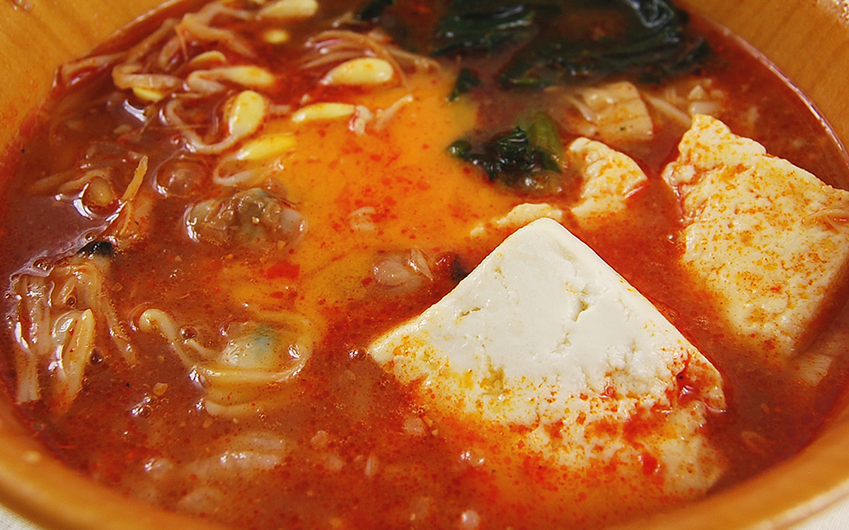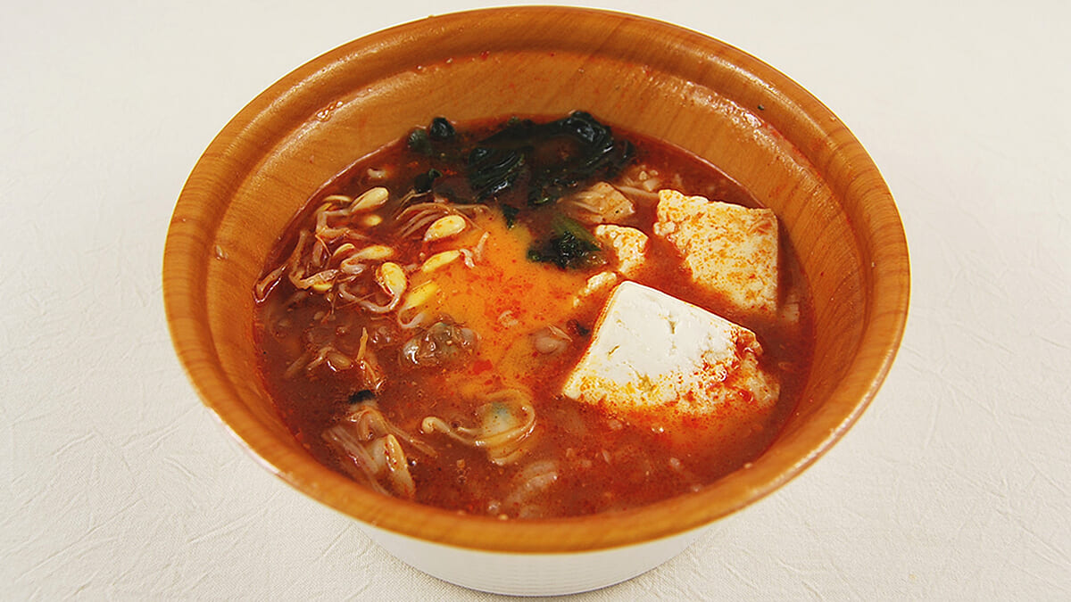 スンドゥブは、韓国語で直訳すること“柔らかい豆腐”を意味する料理。同商品も大きめにカットされた豆腐が入っているほか、あさりや大豆もやし・ほうれん草などが使用されています。中にごはんも入っているため、一品で主食・おかず・汁ものをカバーできます。
