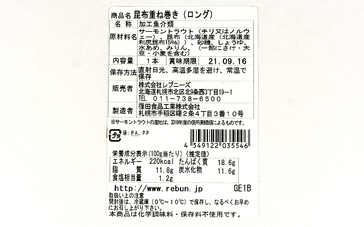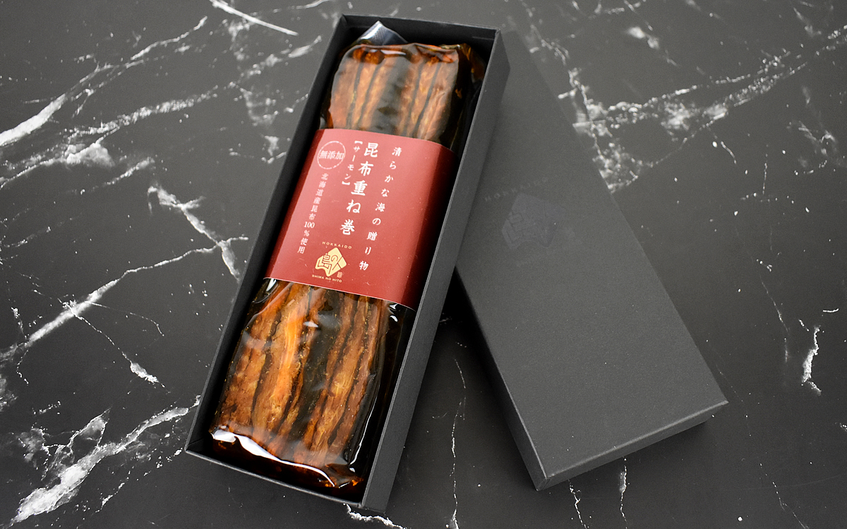 同商品を販売する「島の人」は、“北海道の食を多くの人に届けたい”という想いを持つ土産屋。「サーモン昆布重ね巻」も、こだわりの利尻昆布を使用した商品です。高級感漂う化粧箱を開けると、紅色の帯が巻かれた同商品がお目見え。サーモンと昆布が重なった美しい見た目に、思わず圧倒されてしまいました。