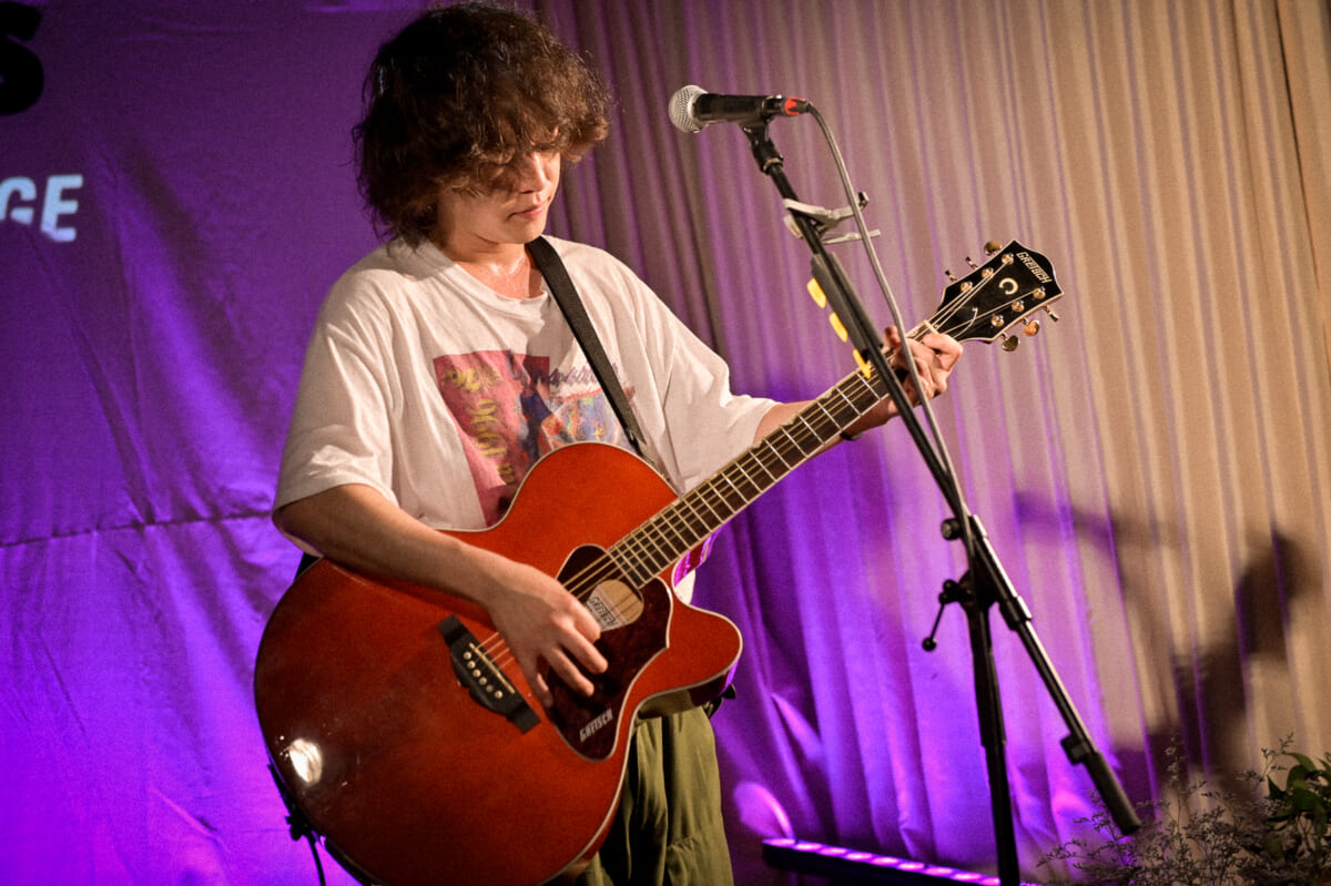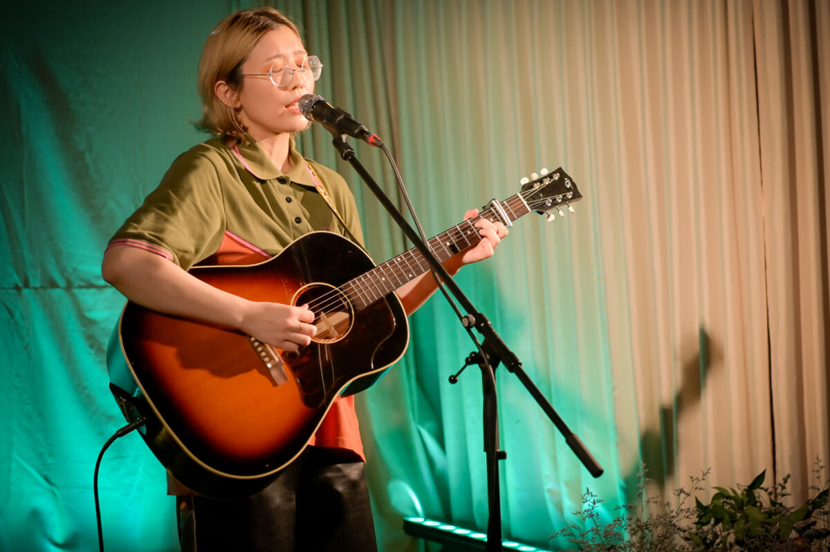 二番手の柴田聡子もアコースティック・ギター1本で登場し、現在のところの最新作『がんばれ!メロディー』収録曲「涙」からスタート。まるで自分以外はそこに存在しないというほどに歌に没入して、弦を爪弾き、すうぅーっと伸びていく歌声が会場のLIVE HAUSに満ちていく。歌い終わり、はにかんだ表情で頭を下げたところで意識がこっちに戻ってきたようで、そんな佇まいを目にして、この人は真正の歌い手だな、と思った。