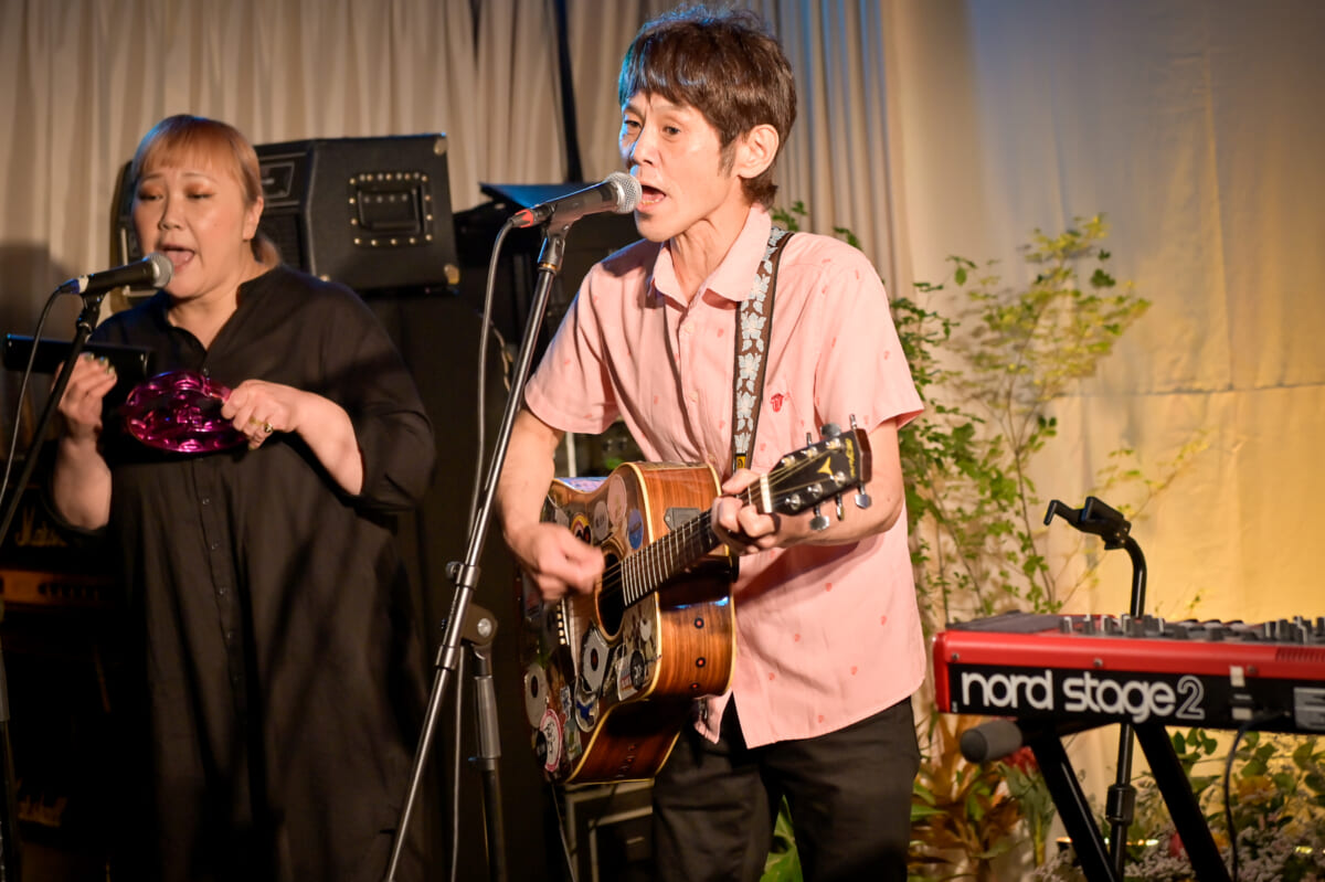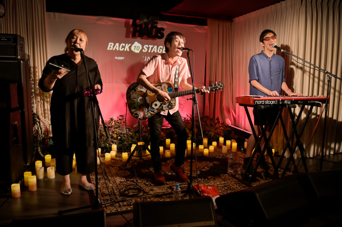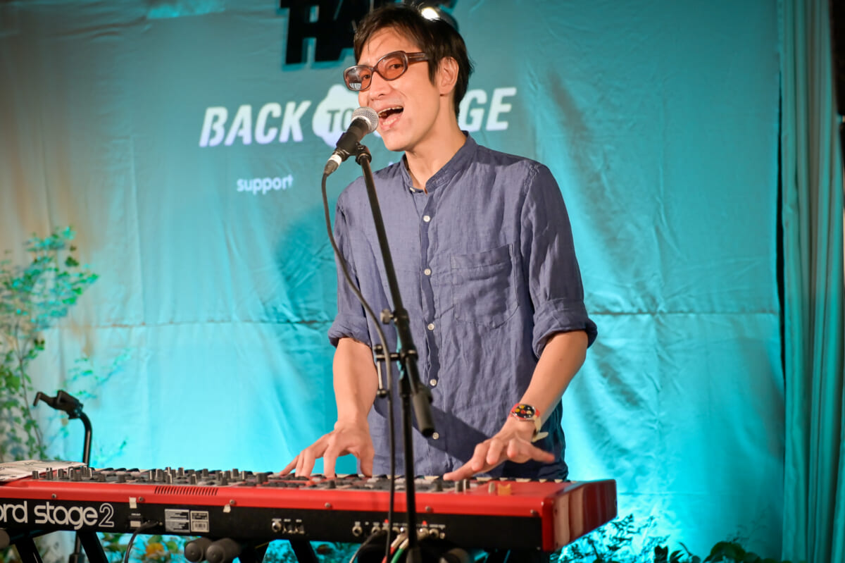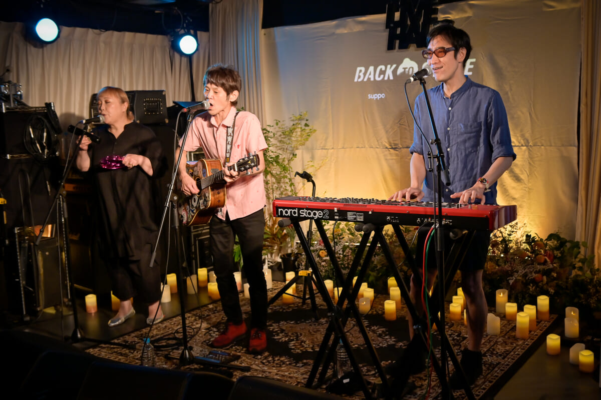 そして、ラストは「BACK TO STAGE」のスペシャル・インタビュアー、サニーデイ・サービスの田中 貴とも交流が深いホフディラン。1曲目は、ちょうど当日に梅雨明け宣言が発表された夜にふさわしい2009年発表の「summer time POP!」。小宮山雄飛の軽快なキーボードに連れられながら、ワタナベイビー、小宮山、そしてコーラスで参加の真城めぐみがハーモニーを重ねていった。後半のオリエンタルな雰囲気を醸し出す鍵盤の調べも含めて、気持ちのよいスタートを切った。