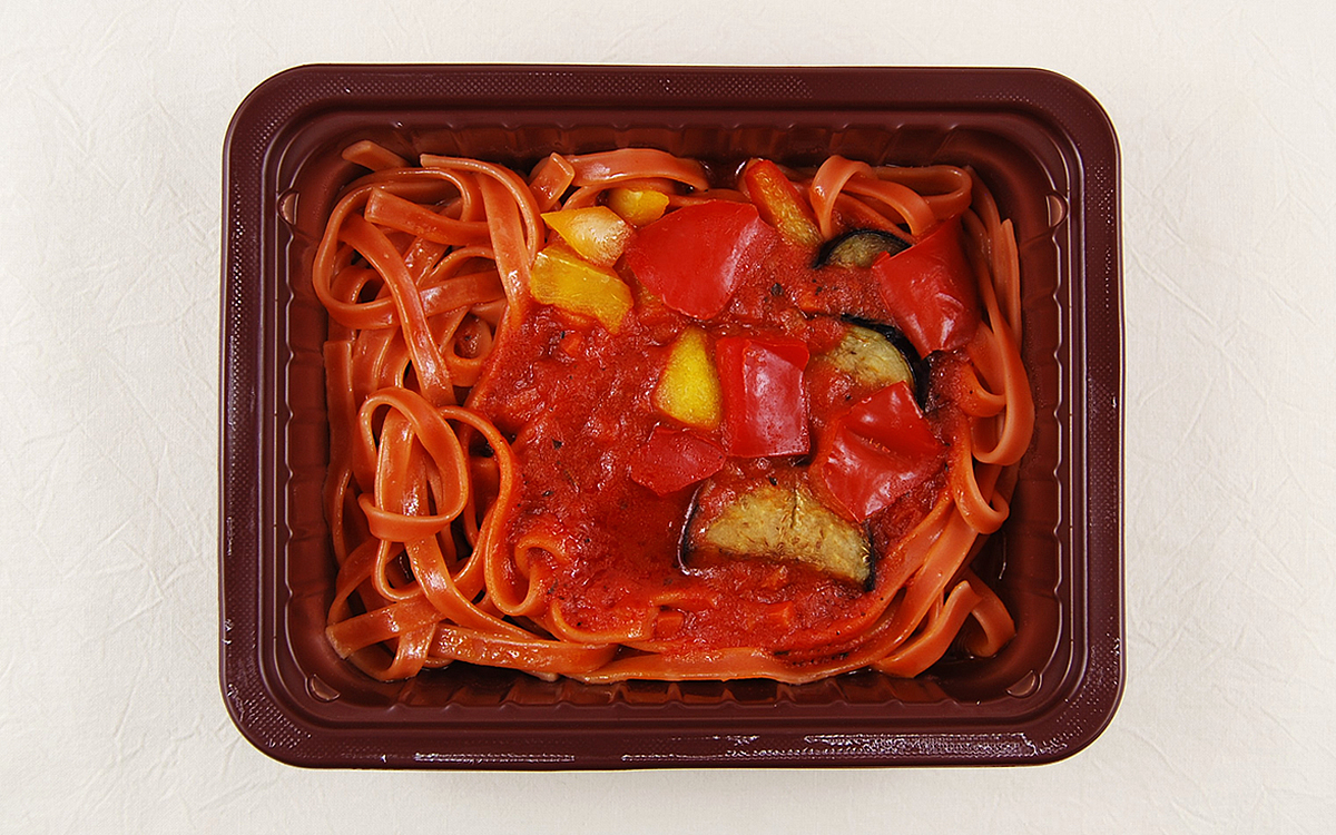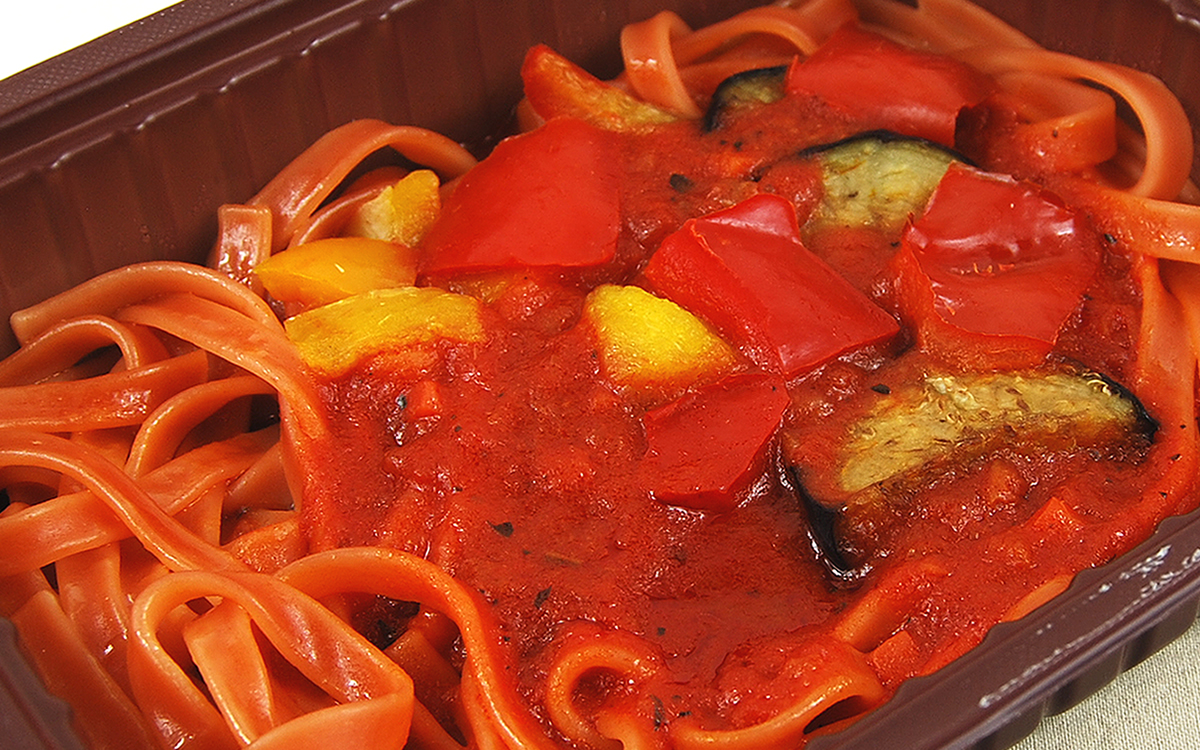 トマトソースを絡めた生パスタに、揚げなすと赤・黄パプリカをトッピングした同商品。食べる際はパッケージ袋から取り出して、トレイのまま電子レンジで約4分30秒~5分30秒加熱してください。わざわざお皿に移し替える必要がないのはうれしいポイントですよね。